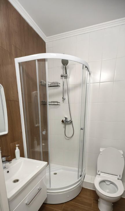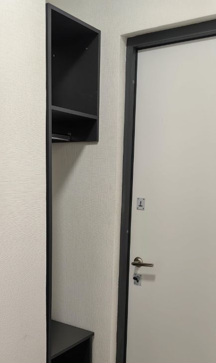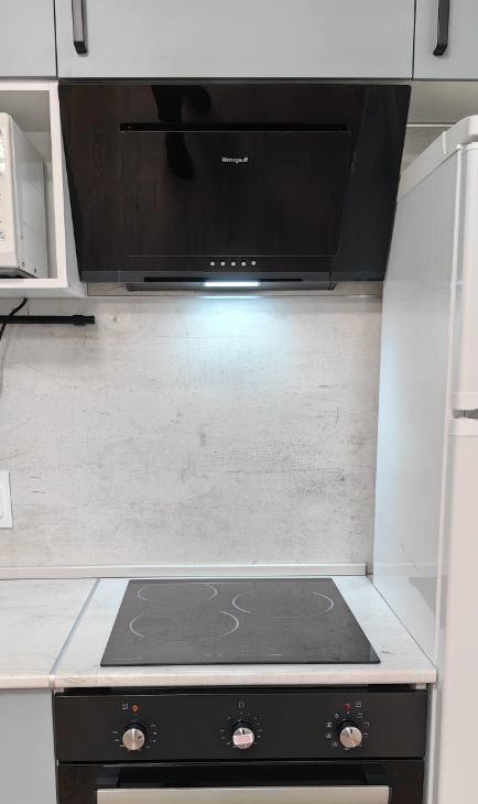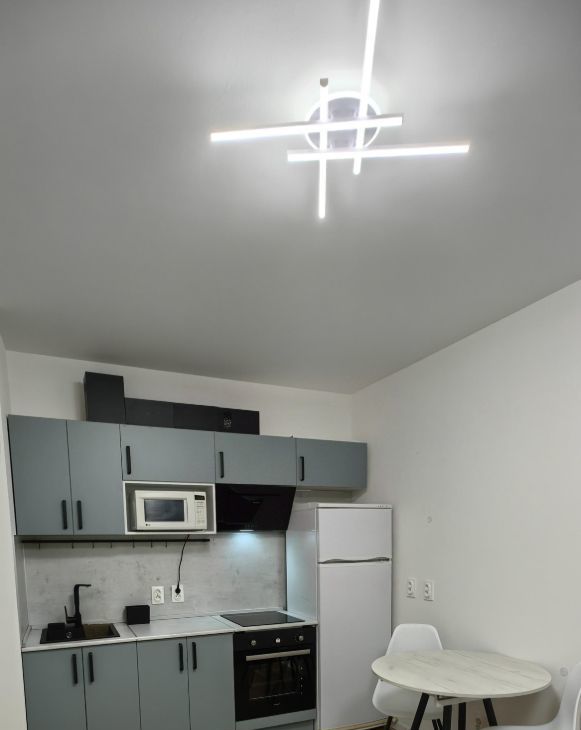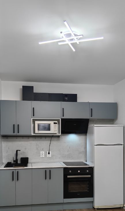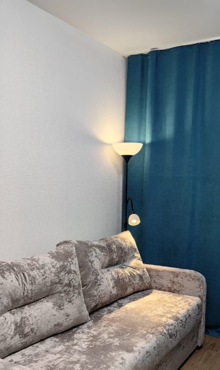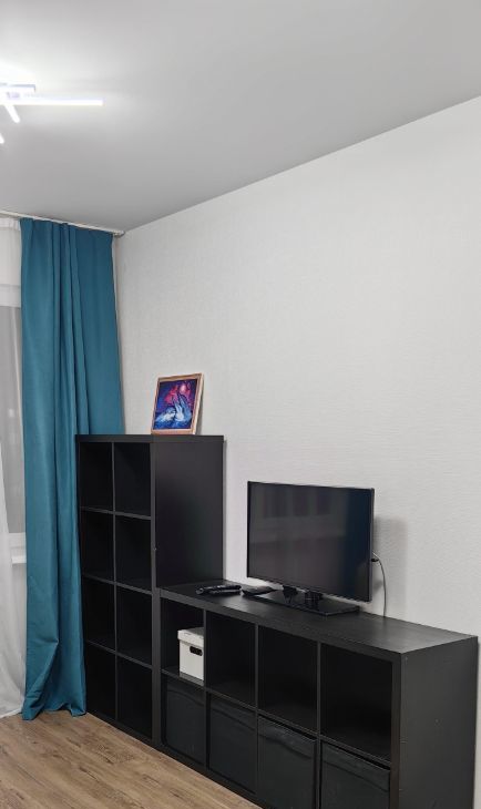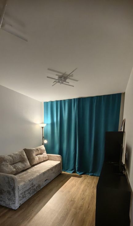 Кухня-гостиная служит основным пространством для отдыха и приема гостей, что делает жилье более функциональным и просторным. Гостиная зона оборудована стильным диваном с механизмом трансформации "тик-так", двумя стеллажами для хранения личных вещей и телевизором. Кухня оснащена всей необходимой техникой, включая холодильник, варочную панель, духовой шкаф с конвекцией и грилем, вытяжку и микроволновку.