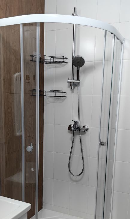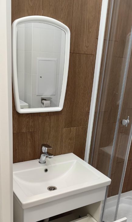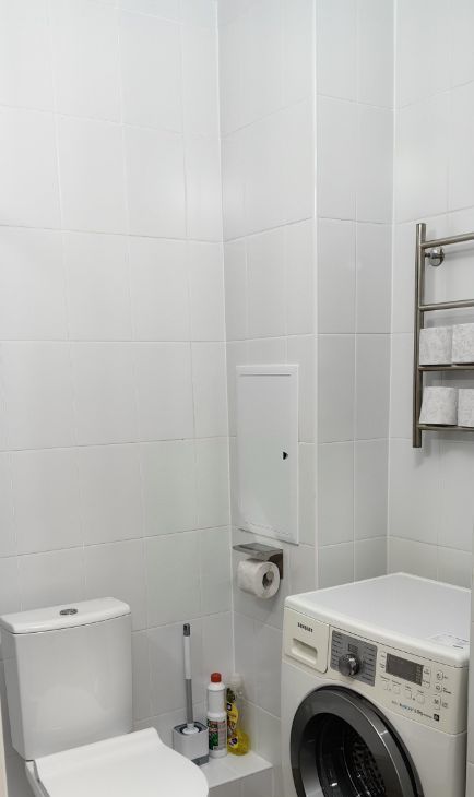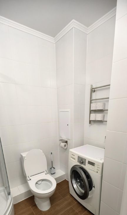 В ванной комнате установлена душевая кабина, стиральная машина, электрополотенцесушитель.