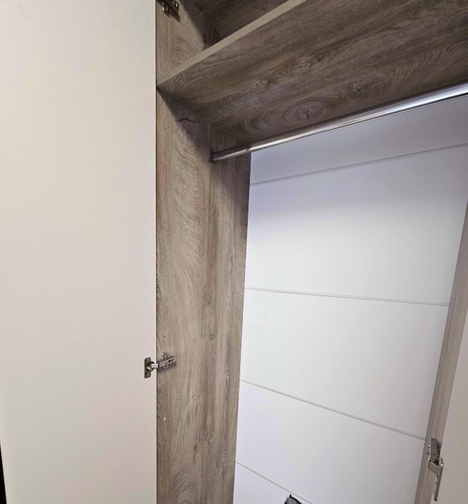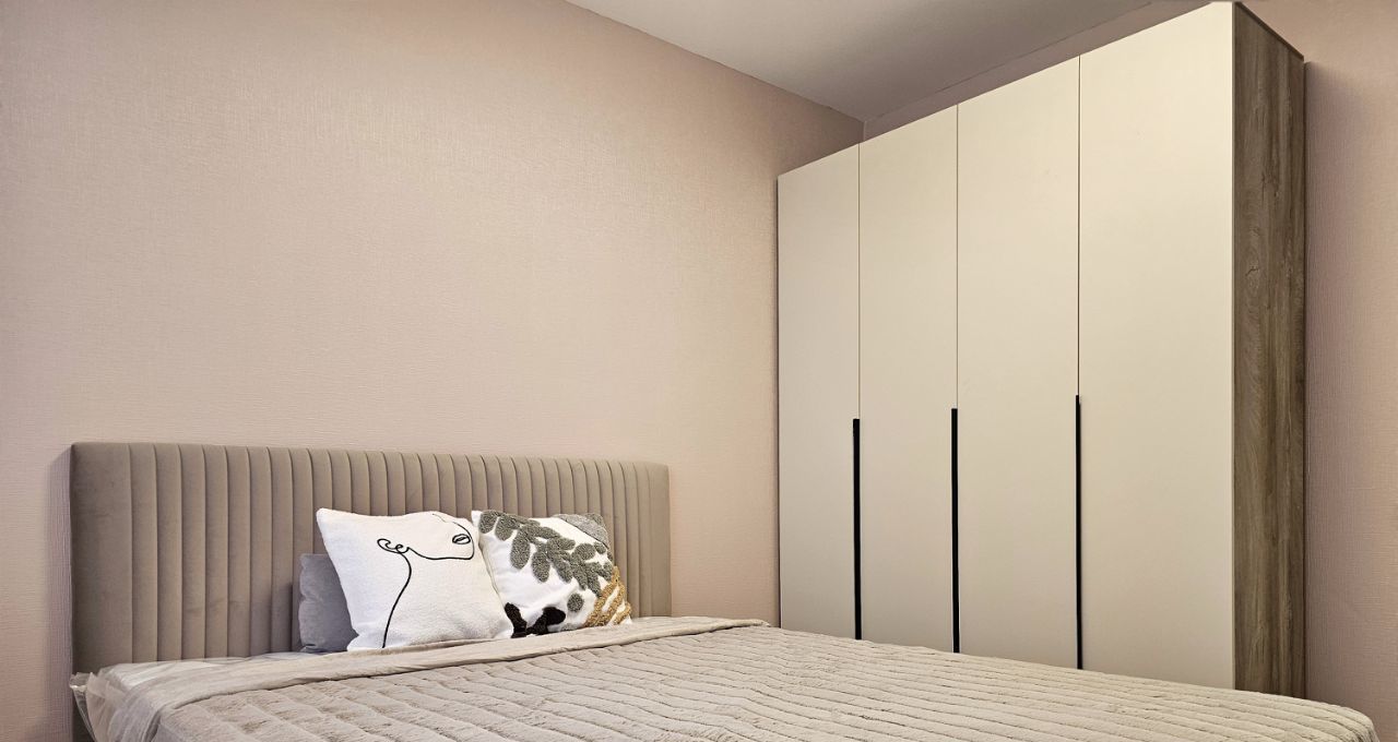 В спальне — большая кровать с подъёмным механизмом и вместительный шкаф.