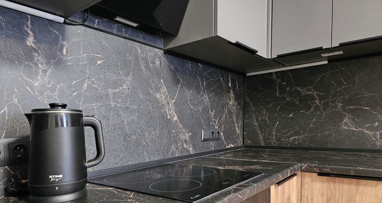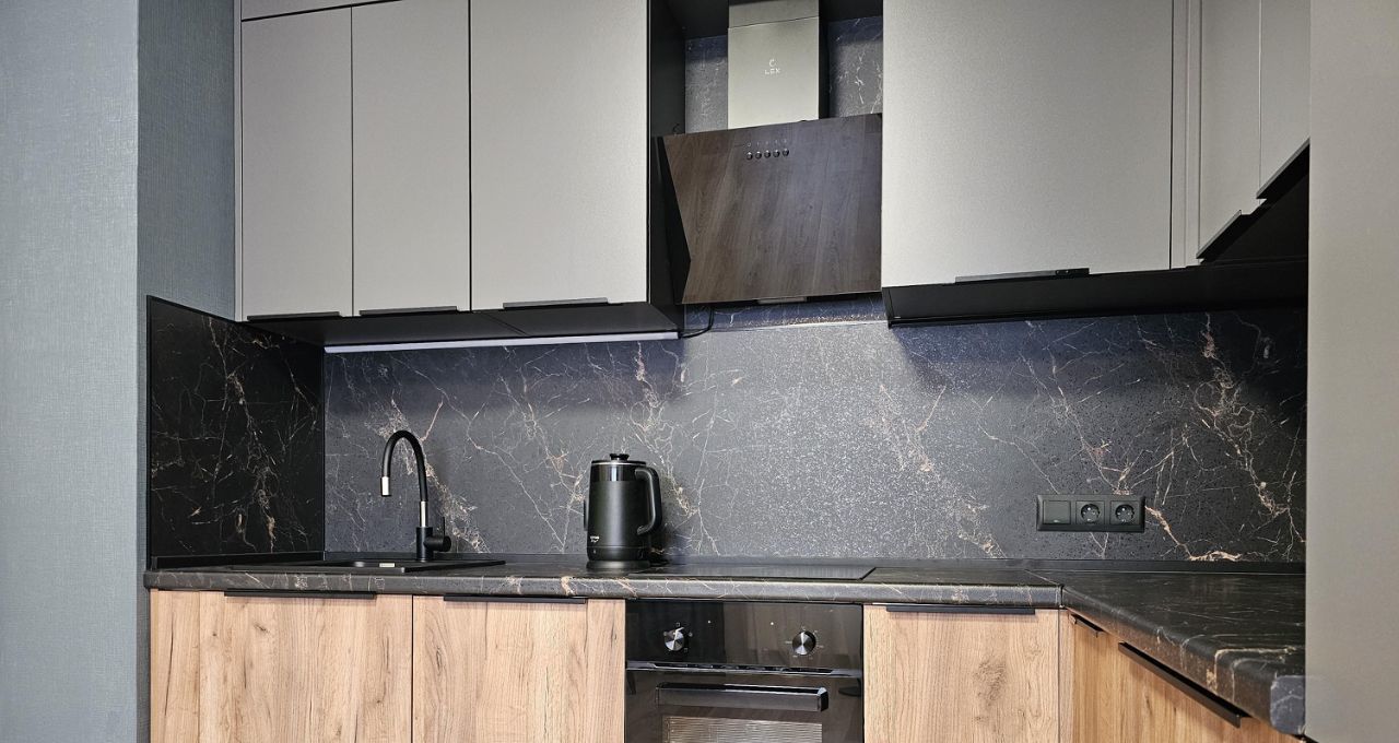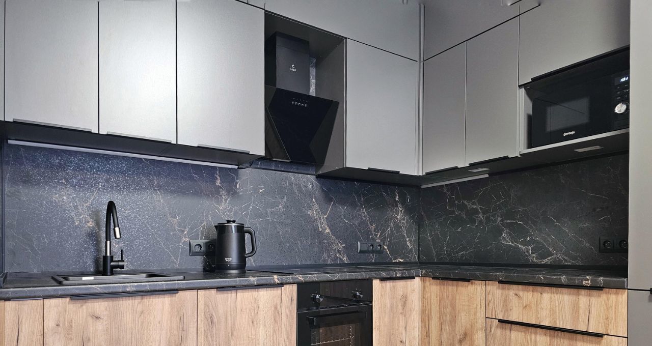 Кухня-гостиная с диваном-кроватью и стильным кухонным гарнитуром, выполненным на заказ. Встроенная техника: посудомоечная машина, холодильник, варочная панель, духовой шкаф, вытяжка