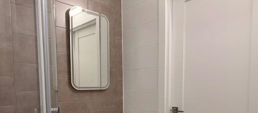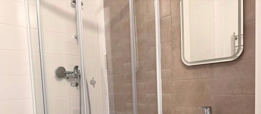В ванной комнате установлена душевая кабина и стиральная машина.