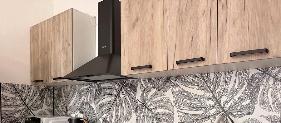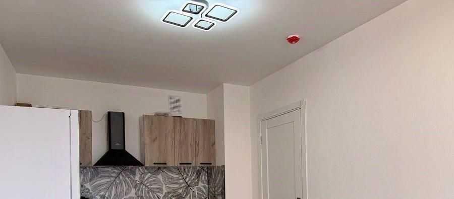 Кухня-гостиная разделена на зоны для готовки с техникой: холодильник, варочная поверхность, вытяжка, микроволновая печь, электрочайник и полноценную зону отдыха с удобным диваном и телевизором.