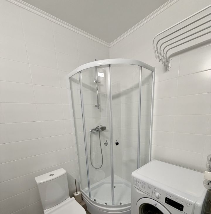 совмещенный санузел с душевой кабиной и стиральной машиной.