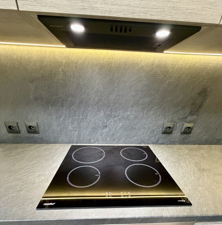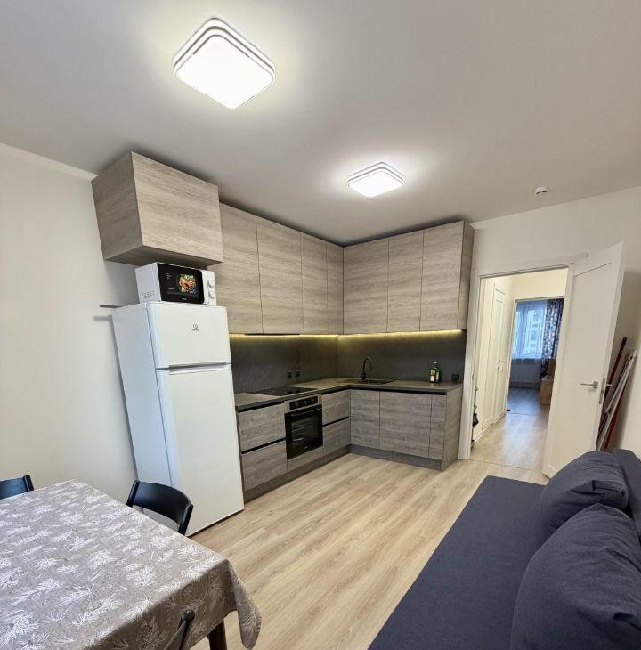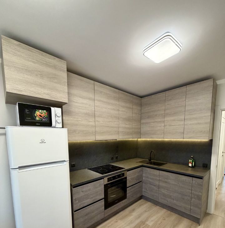 кухня-гостиная (15 кв.м), с новым 1-спальным диваном, новым кухонным гарнитуром со встроенной индукционной плитой, духовым шкафом, вытяжкой, микроволновкой, холодильником, чайником и минимально необходимой посудой