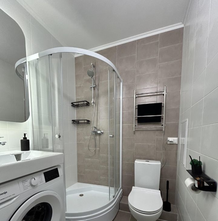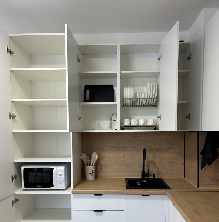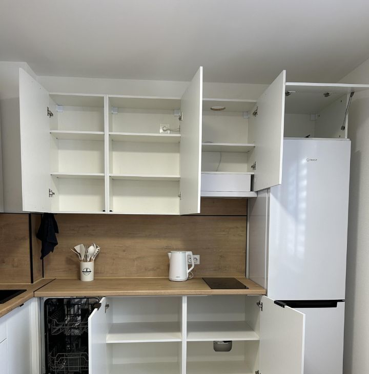 Квартира полностью укомплектована для Вашего комфортного проживания, включая новое постельное белье, полотенца и полноценный набор посуды. В квартире предусмотрено много мест хранения (шкафы, комоды). Установлена полноценная вместительная кухня, в которой имеется большой холодильник, микроволновая печь, индукционная плита на две конфорки, электрический чайник и встроенная посудомоечная машина. В ванне установлена стиральная машина. Также имеется сушилка для белья и утюг.