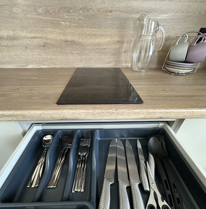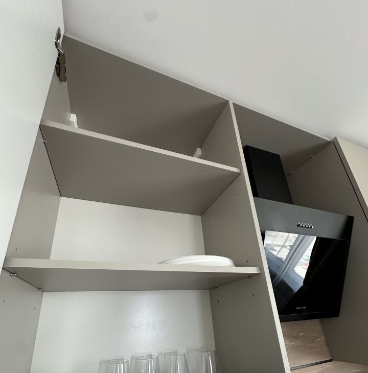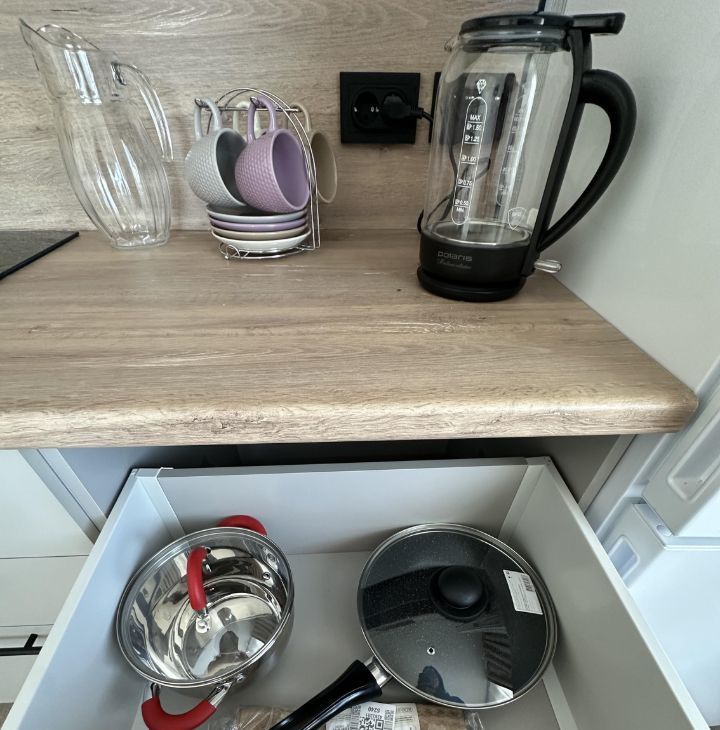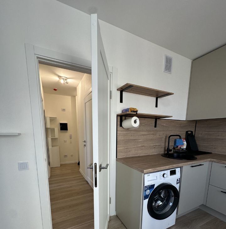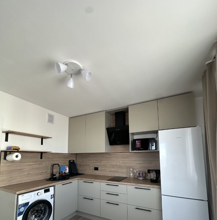 Просторная кухня оснащена удобным кухонным гарнитуром и всей необходимой бытовой техникой, включая холодильник, микроволновку,вытяжку и стиральную машину.