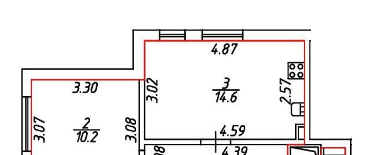 Площадь общая - 35 кв.м. Кухня-гостиная 14,6 кв.м. два окна. Спальня 10.2 кв.м.