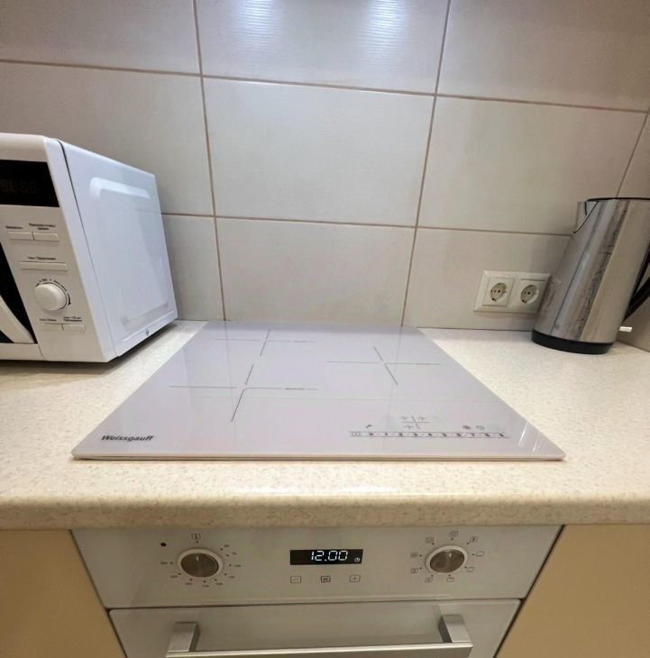 Кухня-гостинная укомплектована кухонным гарнитуром, холодильником, варочной плитой, духовкой, микроволновой печью, чайником. Имеется большой раздвижной стол и 4 стула. Раздвижной двухспальный диван.