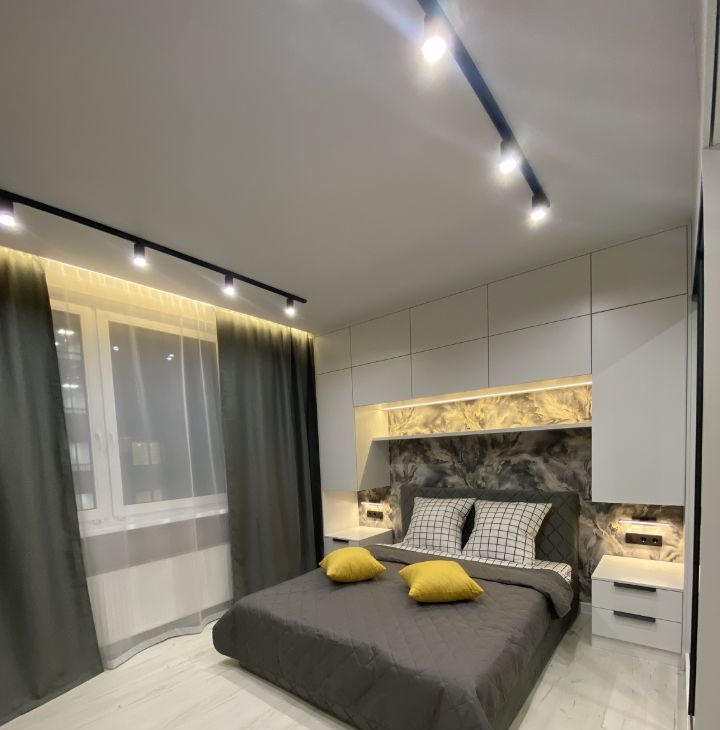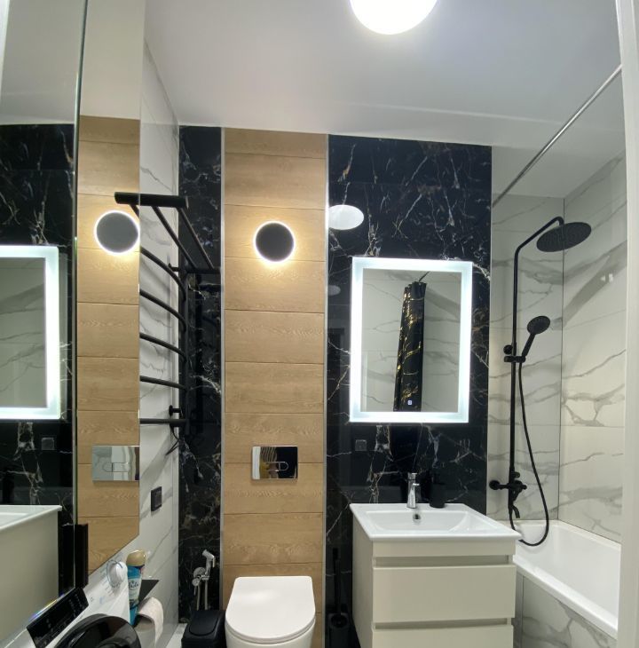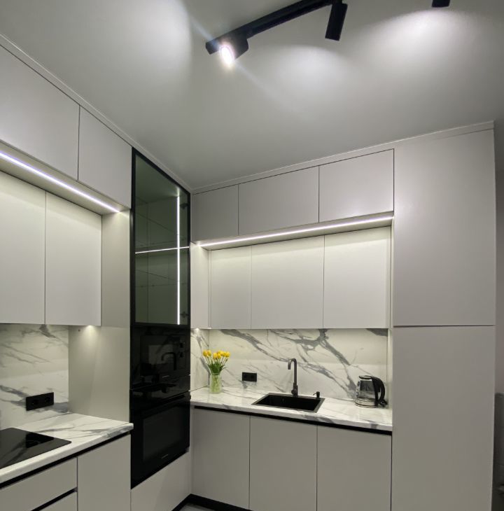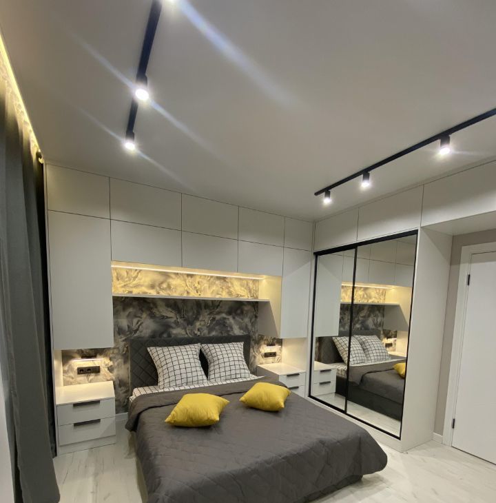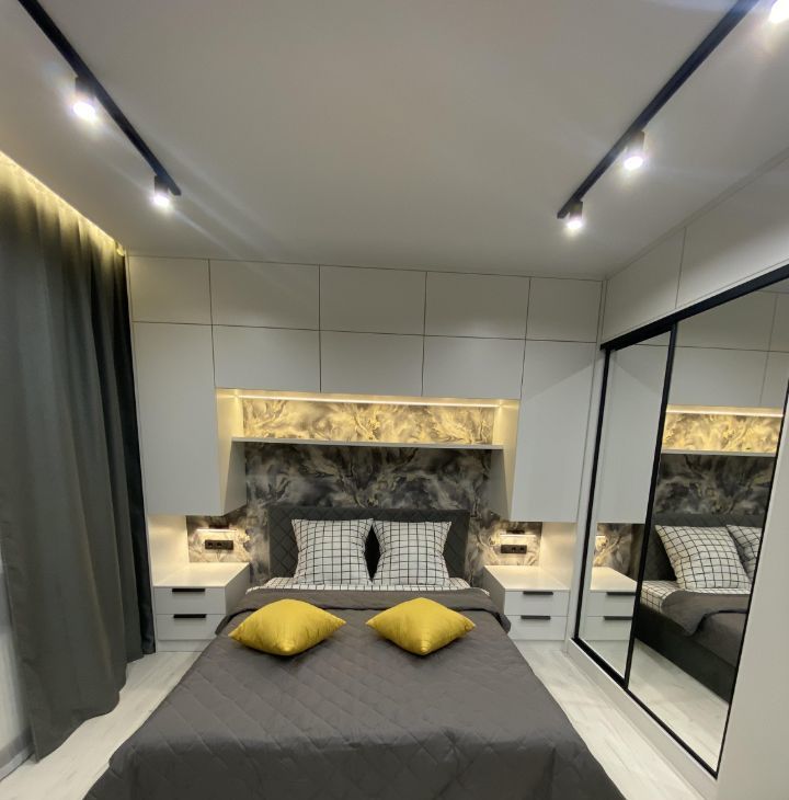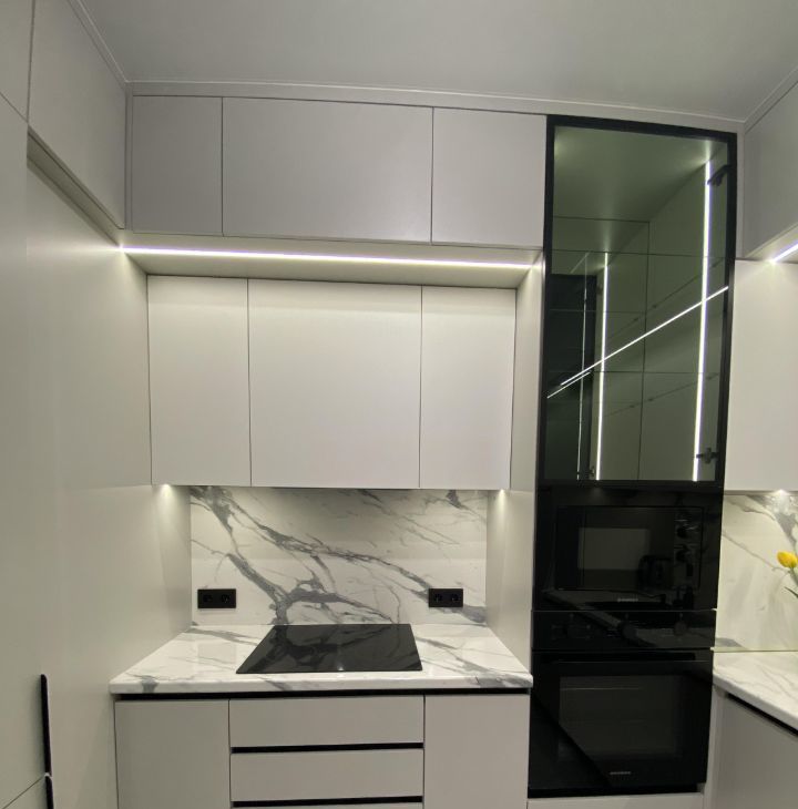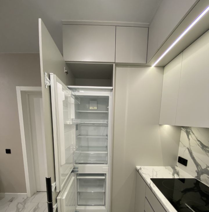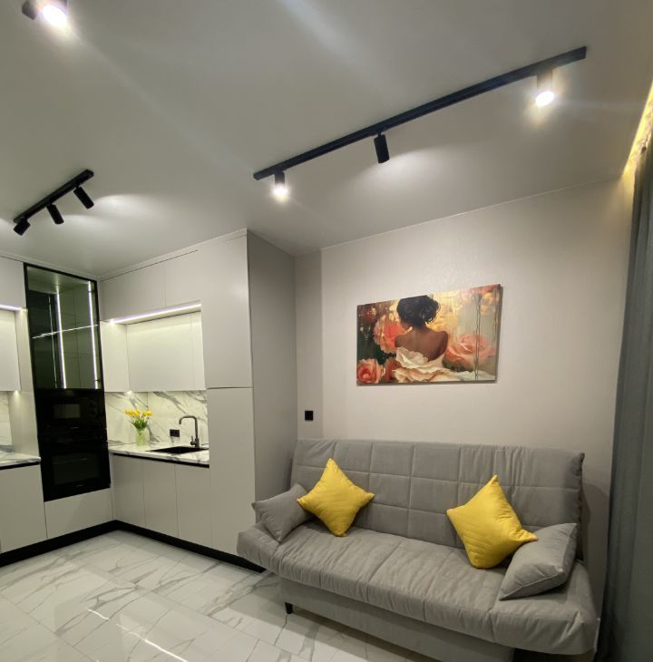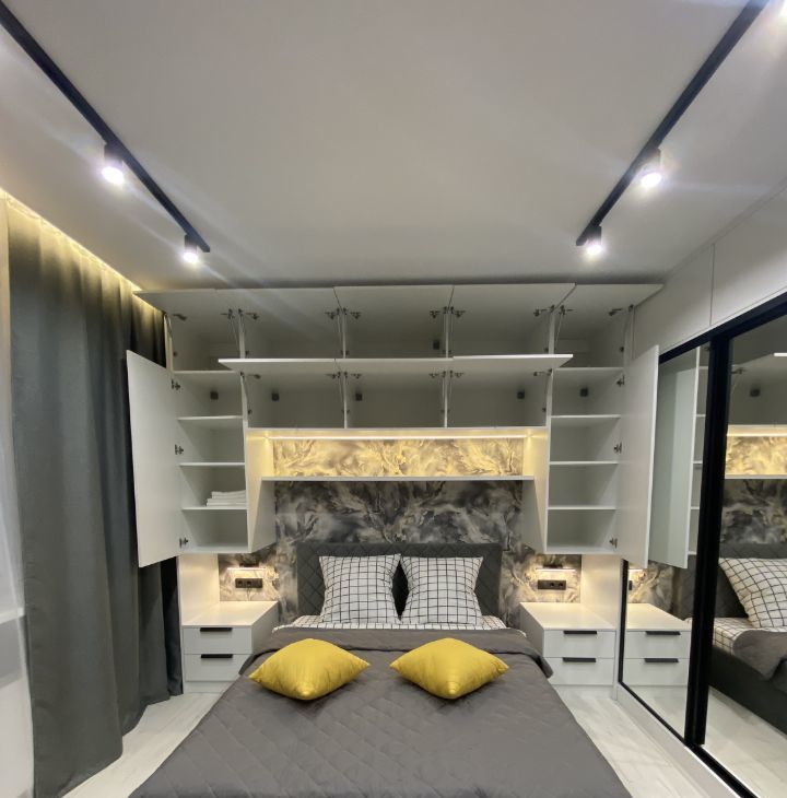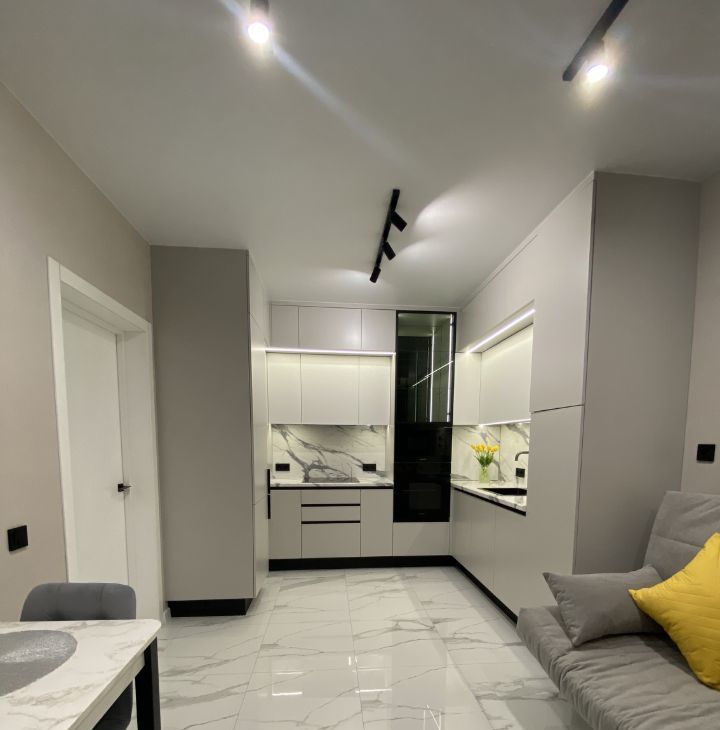 Для проживания есть все необходимое: кухня со встроенной техникой (холодильник, посудомойка, духовка, микроволновка и т.д.), кровать, диван, стол, стиральная машина. Очень много мест хранения, все продумано до мелочей.