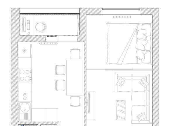 Удобно разделены зоны отдыха и сна, есть оборудованная гардеробная, на лоджии организован мини-кабинет.