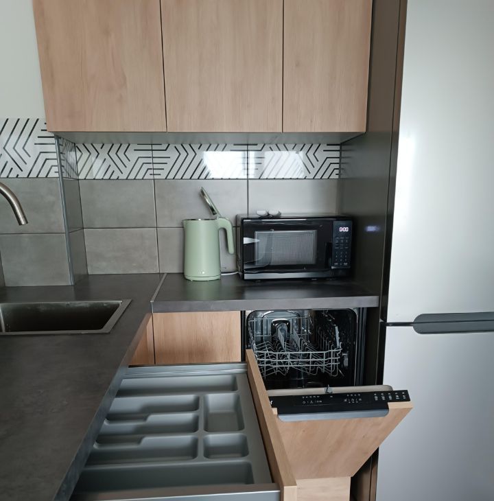 На кухне раскладной диван с дополнительным спальным местом.