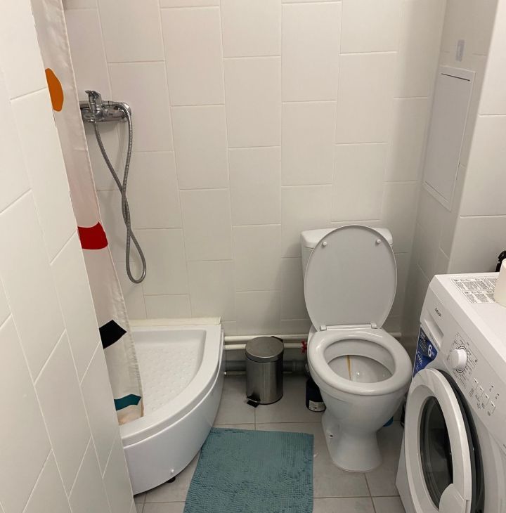 В комнате находится двуспальная кровать и вместительный шкаф. Из мебели также имеется удобный диван. Ванная комната оборудована стиральной машиной и душевой кабиной.