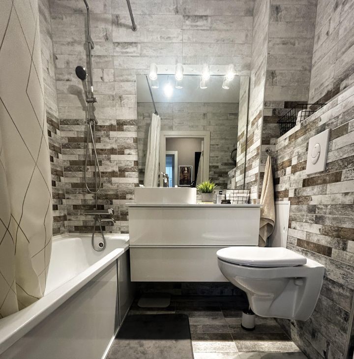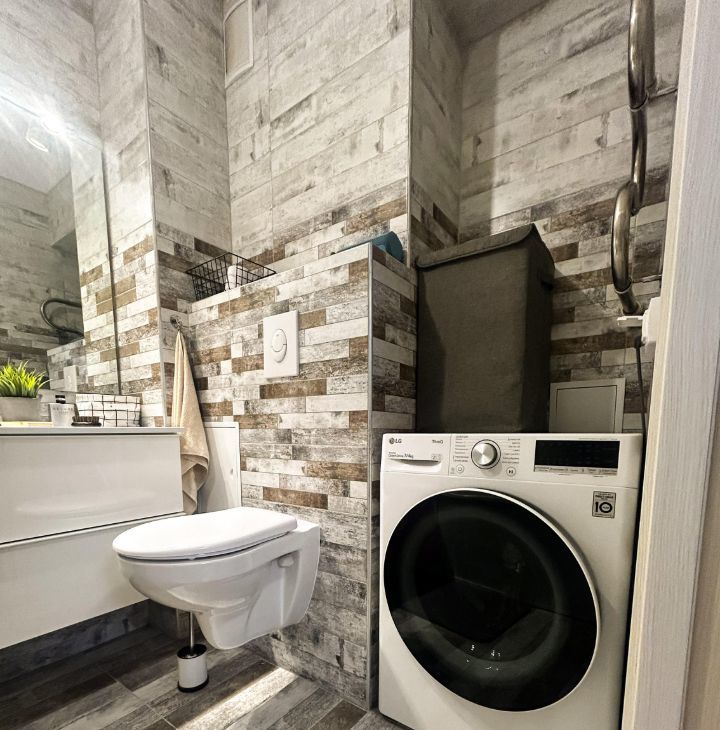 В санузле выполнена современная отделка с акцентом на уют и долговечность. Установлена качественная сантехника.