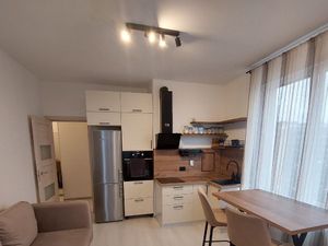 Полноценная однокомнатная квартира с дизайнерским ремонтом. Всё абсолютно новое. Жилая комната поделена на зону отдыха и спальную зону. Есть кровать 90/200, угловой диван, который может служить двухспальным местом, вместительный шкаф для хранения вещей, телевизор для просмотра любимых сериалов, журнальный стол для ноутбука. Кухня полностью оборудована всеё необходимой мебелью и техникой: холодильник, посудомоечная машина, варочная поверхность, духовой шкаф, СВЧ, телевизор. Сан/узел совмещенный с просторной душевой кабиной, установлена стиральная машина. Полы в сан/узле и в коридоре с подогревом, а также стена в сан/узле с подогревом для быстрой сушки белья. В коридоре встроен вместительный шкаф для хранения вещей.