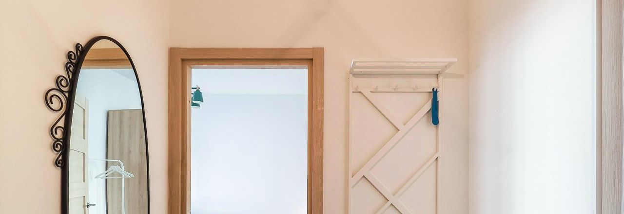 В коридоре установлена вешалка, большое зеркало, а также обувница.