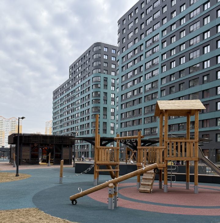 Большой двор без машин, с местами для отдыха и детскими площадками.