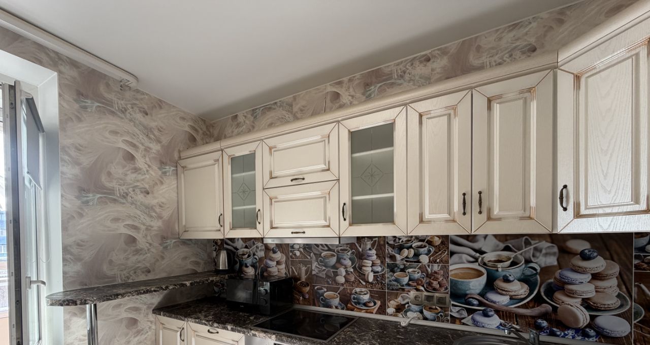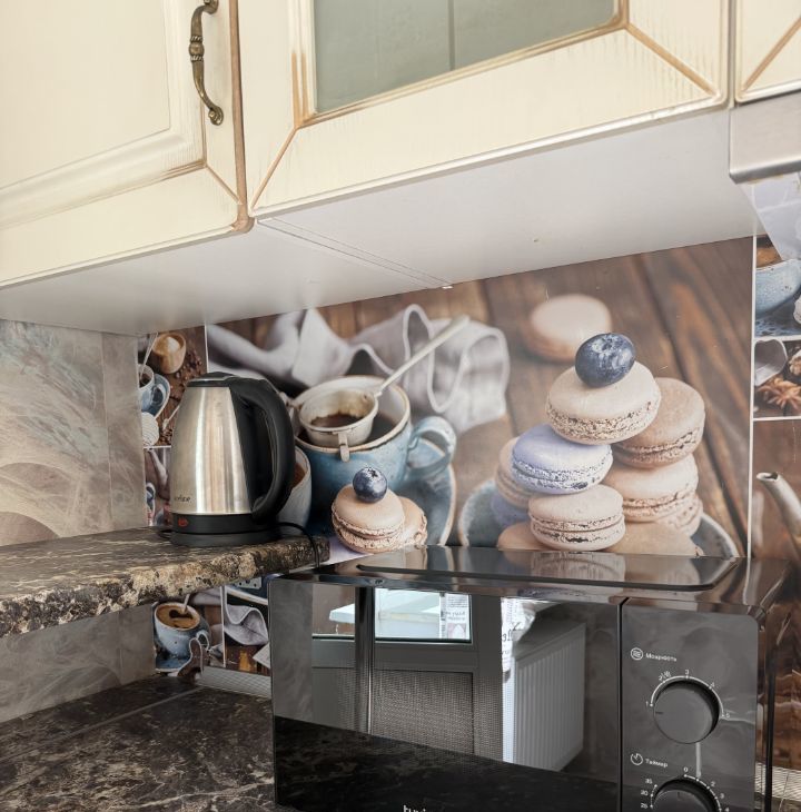 Просторная кухня оснащена необходимой бытовой техникой, включая холодильник и микроволновую печь. Из кухни есть выход на балкон, где можно наслаждаться свежим воздухом.