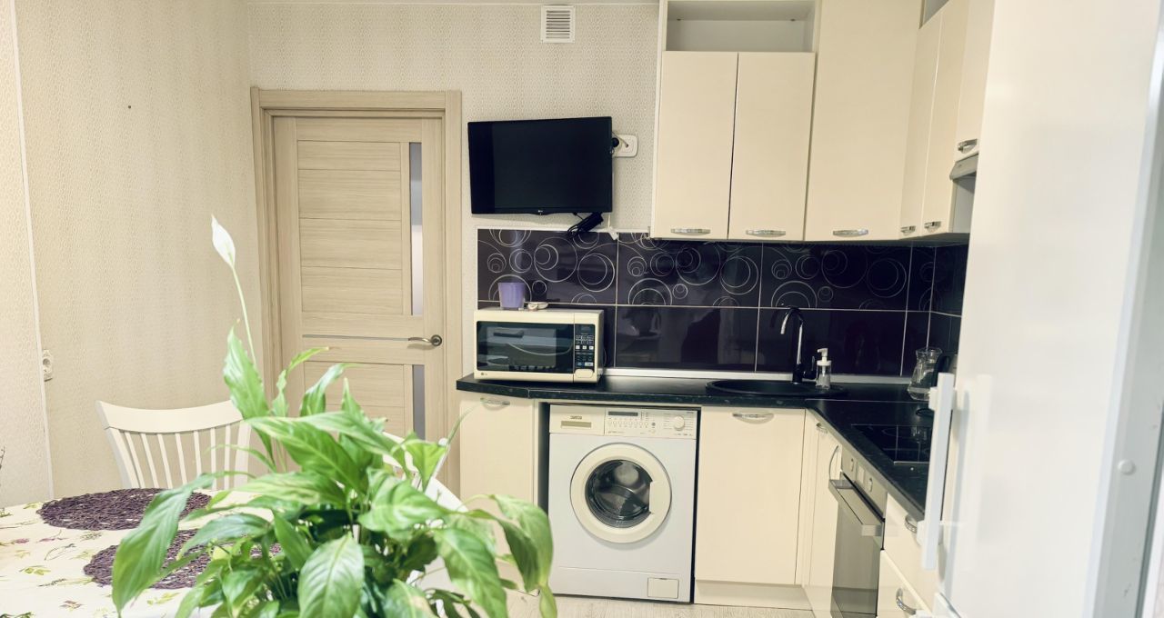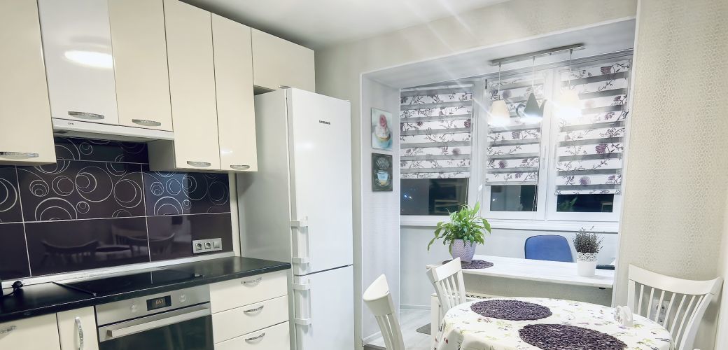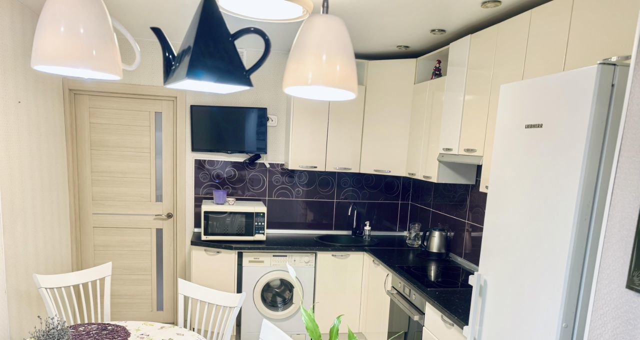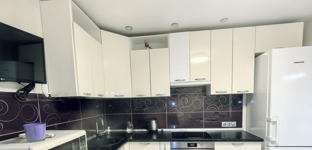 Полноценная кухня со встроенной техникой: варочная поверхность, духовой шкаф, посудомоечная машина, холодильник, СВЧ-печь, электрочайник, вся необходимая посуда и утварь.