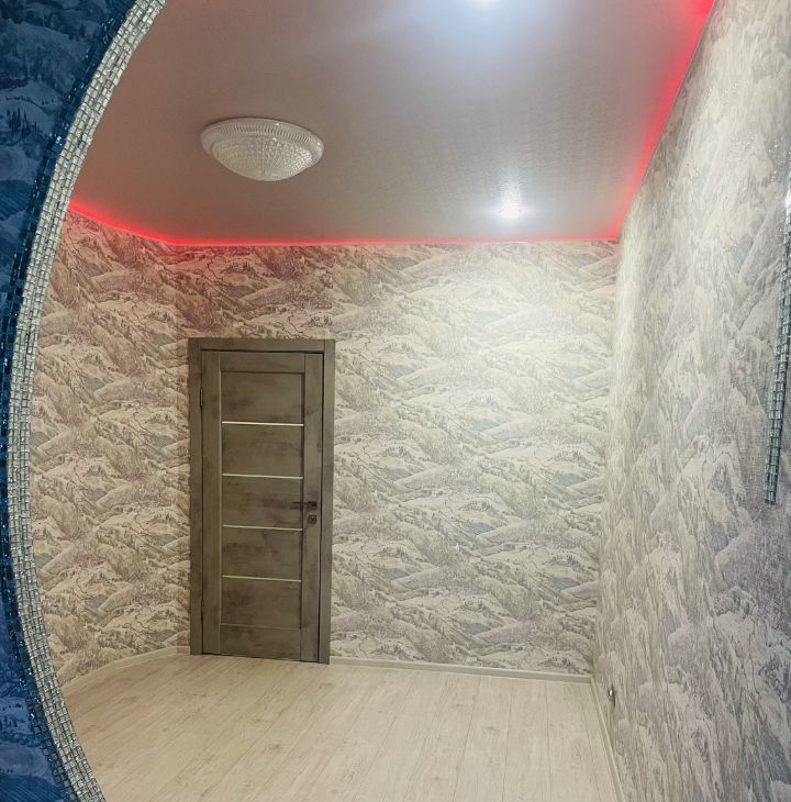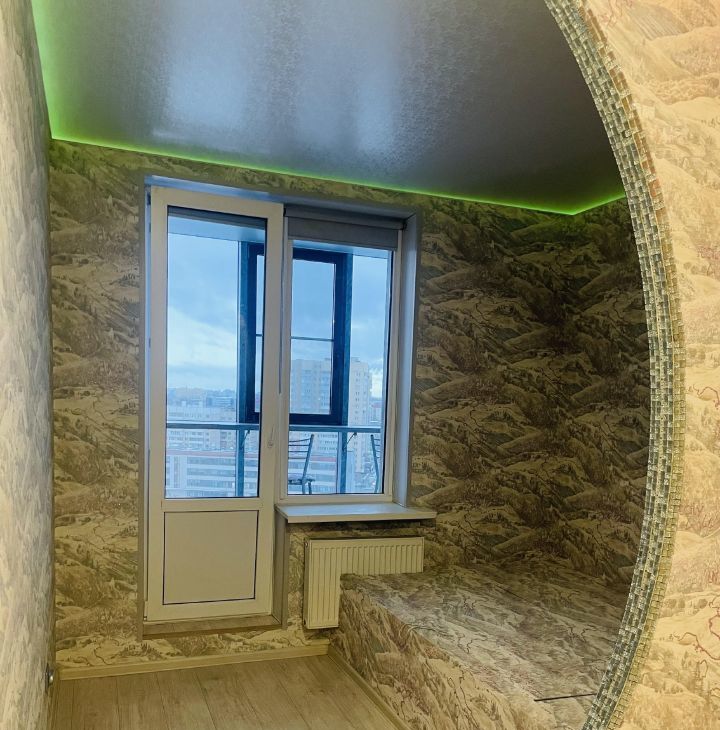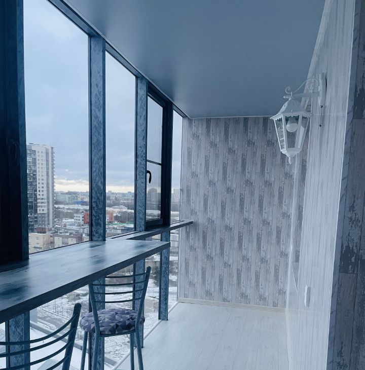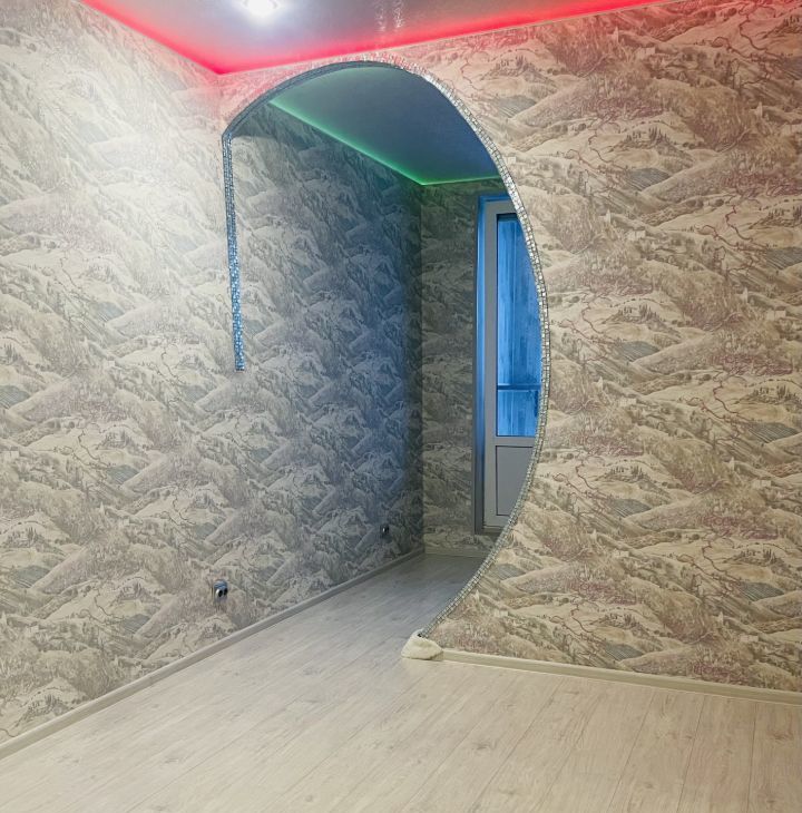 авторский ремонт с эксклюзивными акцентами: венецианский фонарь на лоджии, ручки Swarovski на дверях, неоновая подсветка арки;