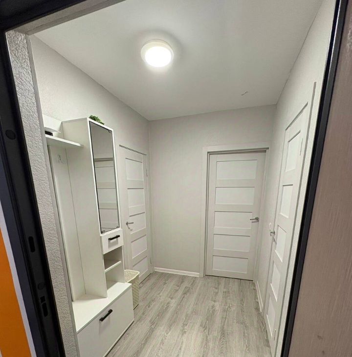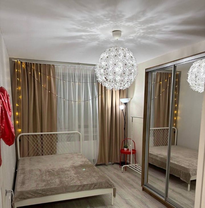 - в комнате расположена кровать 2х спальная, вместительный 3х створчатый шкаф купе, с зеркалами во всю высоту шкафа- это увеличивает пространство в комнате и придаёт больше света. Комната правильной формы, что позволит сделать перестановку по Вашему желанию.