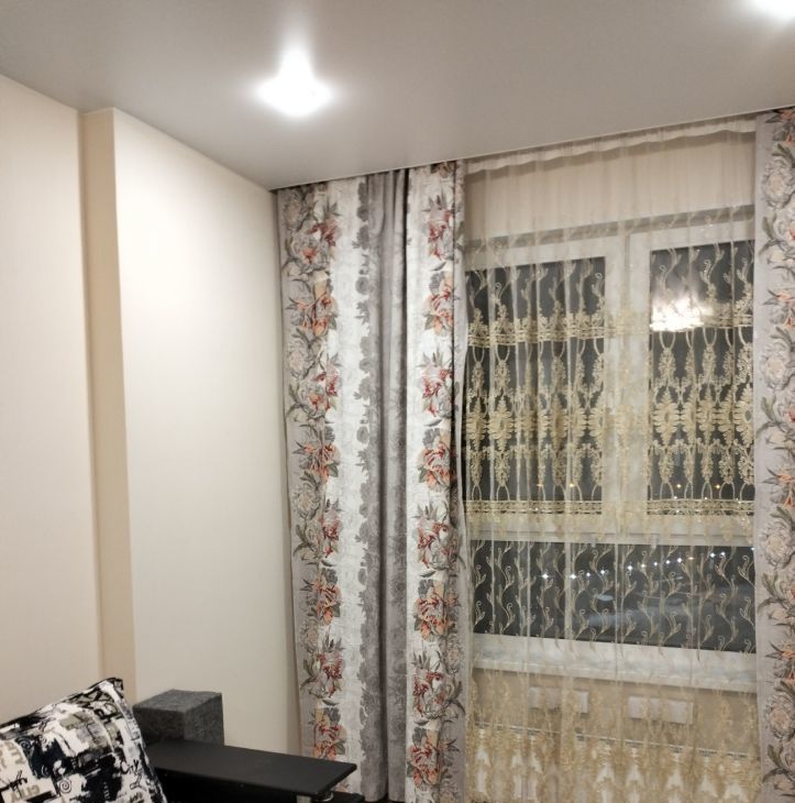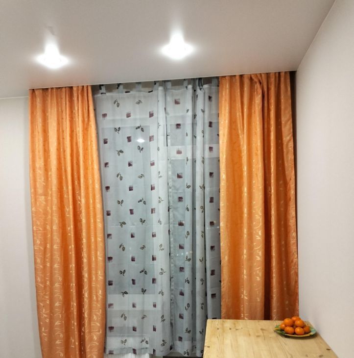 Потолки натяжные, в комнате два вида освещения, в центре люстра и по углам точечные.