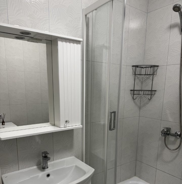 Обстановка: В комнате - удобный диван, большой шкаф, ТВ. На кухне - холодильник, духовой шкаф, СВЧ, стол со стульями, ТВ. В санузле - стиральная машина, душевая кабина, умывальник и шкафчик с зеркалом.