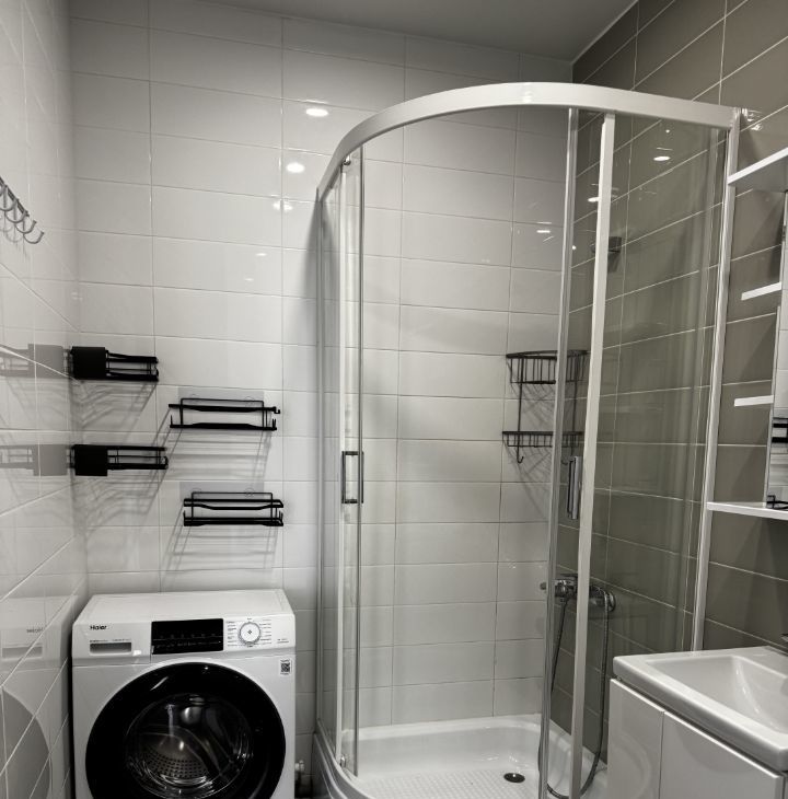 ванная комната: душевая кабинка, стиральная машина, электро-сушитель, шкафчик с зеркалом, умывальник, теплый ПОЛ.