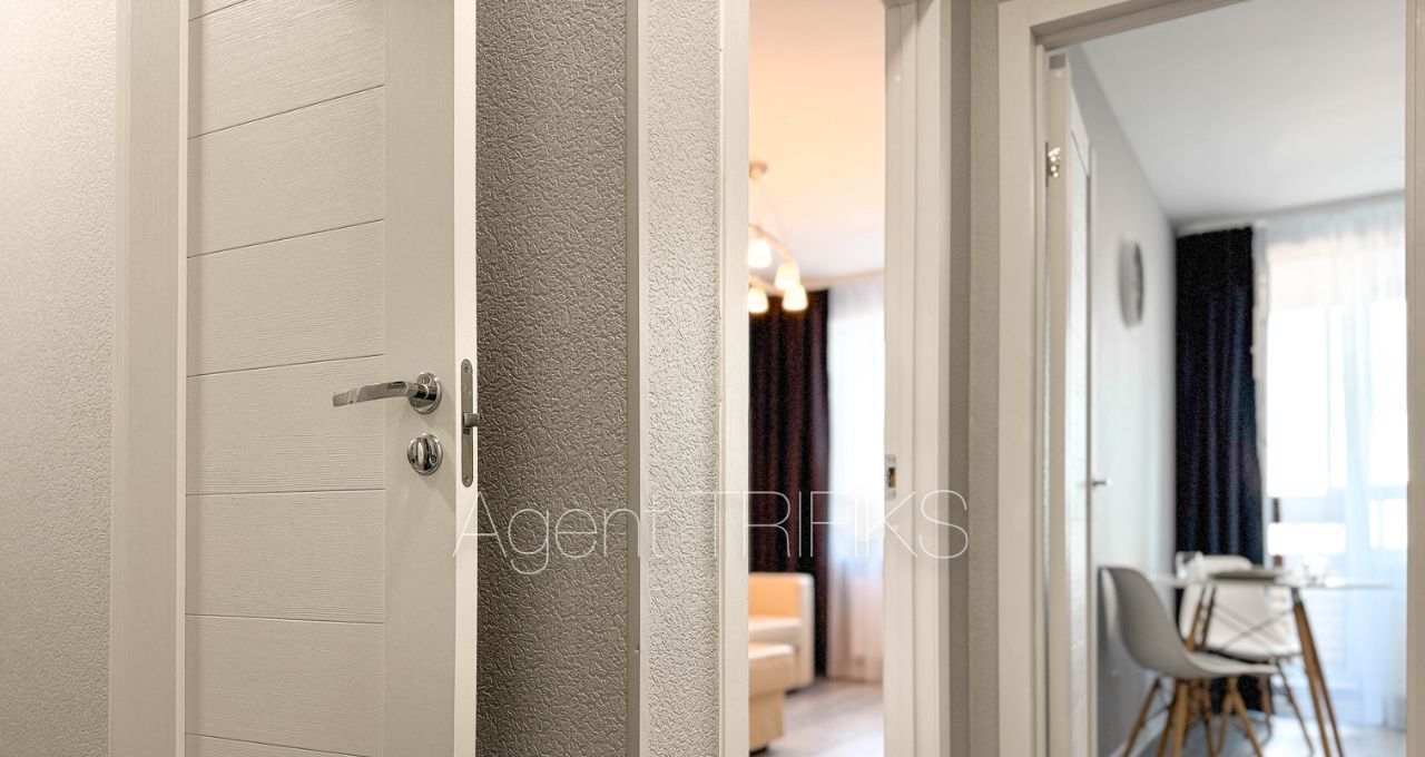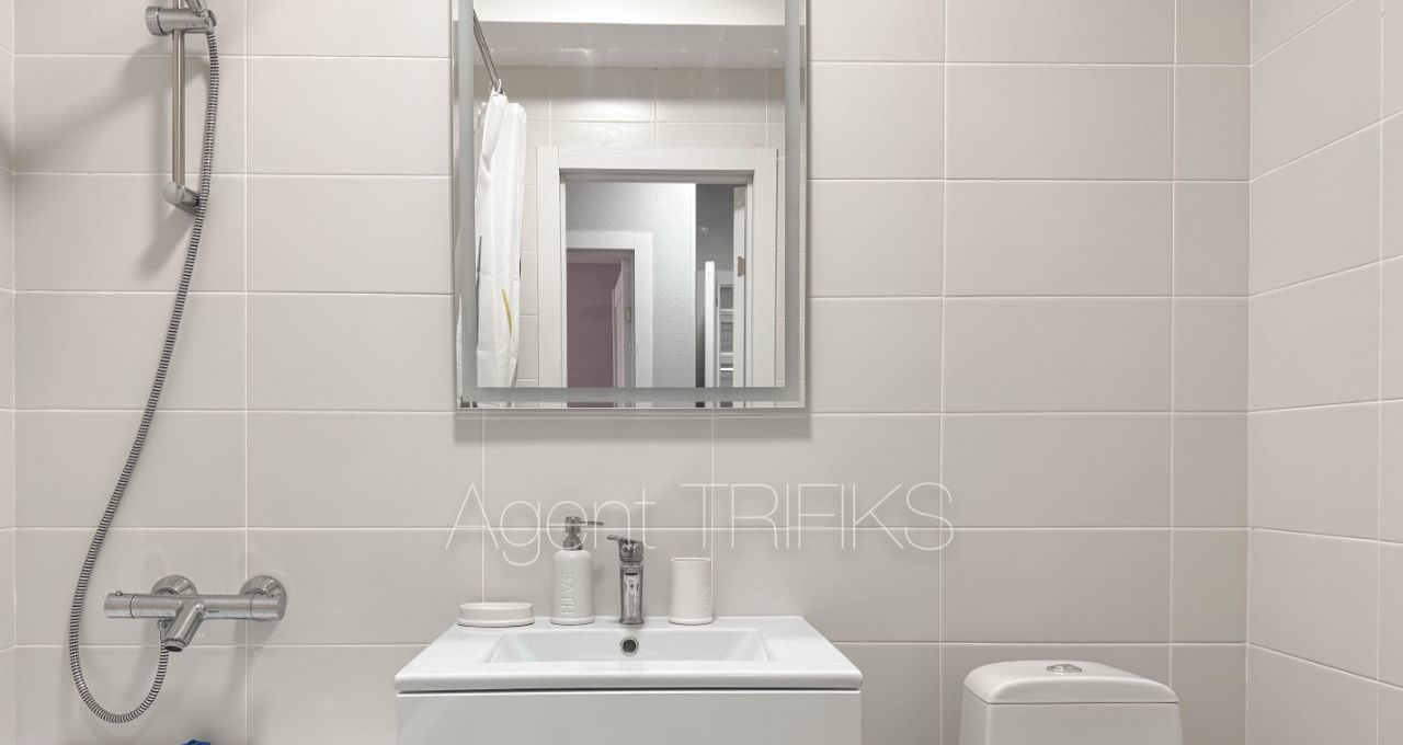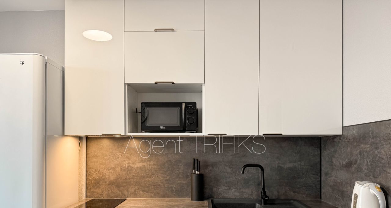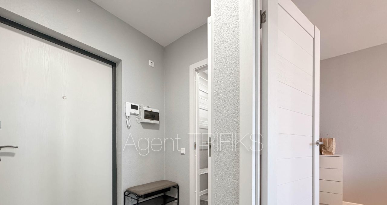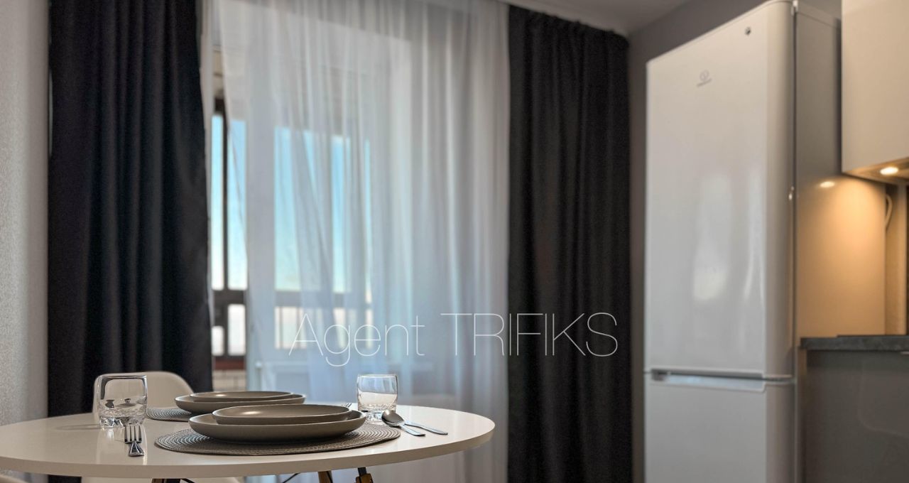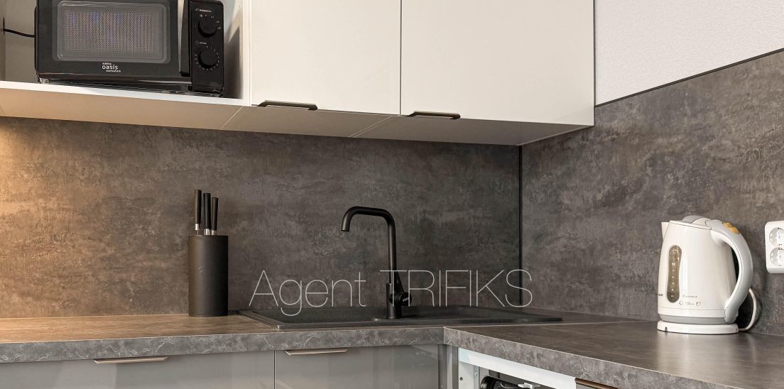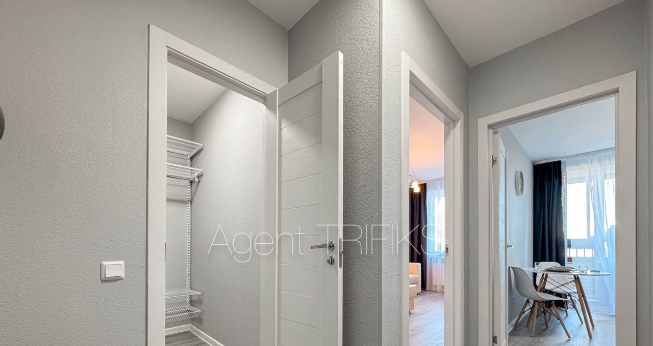 Квартира полностью укомплектована всем необходимым для комфортного проживания. Есть гардеробная для удобного хранения вещей . В жилой комнате — раскладной кожаный диван, тумба под телевизор и комод. ТВ можем установить по запросу.