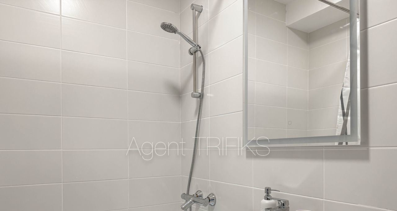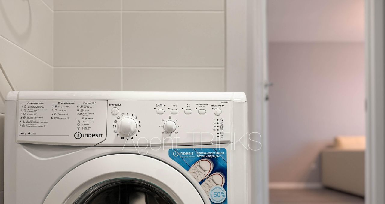В санузле установлена полноценная ванна, стиральная машина и зеркало с подсветкой .