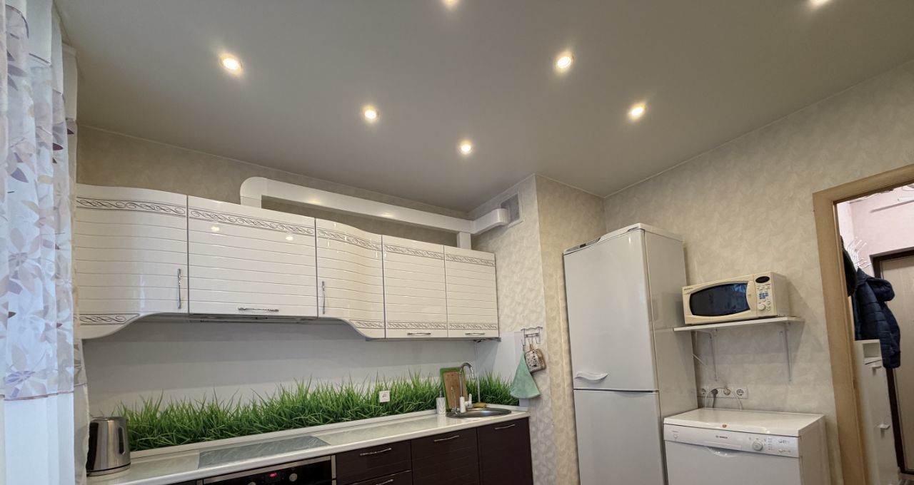 Также в квартире остается полный комплект бытовой техники — холодильник, посудомоечная и стиральная машины, микроволновка, чайник, большой телевизор.