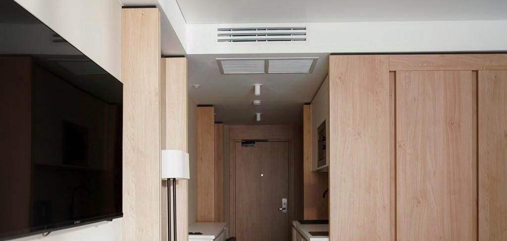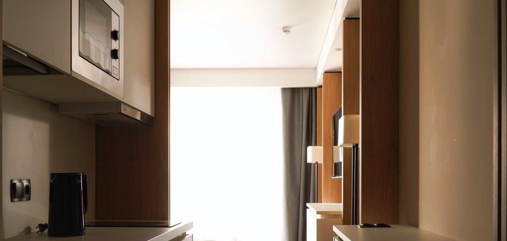 В апартаменте есть все, что нужно для проживания: бытовая техника, текстиль, посуда. Кухонная зона отделена от комнаты и находится в прихожей.