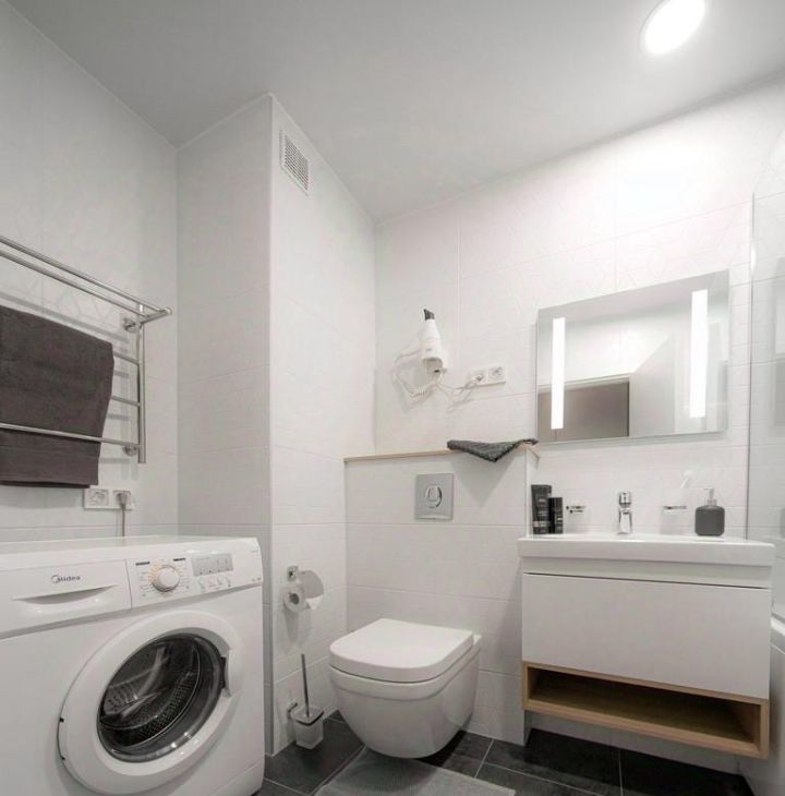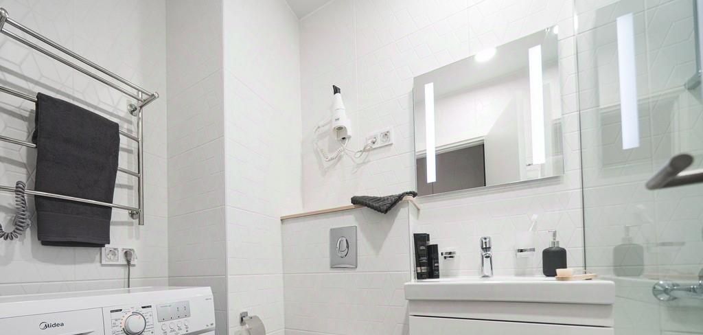 - В ванной комнате установлена сантехника высокого европейского качества и полноценная ванна. Также в номере есть стиральная машина, сушилка для белья, утюг и гладильная доска.