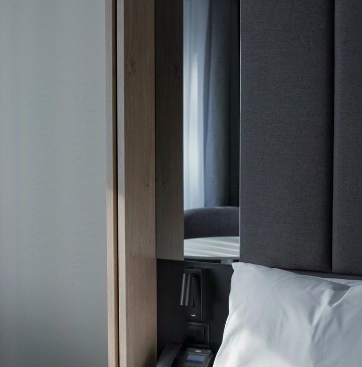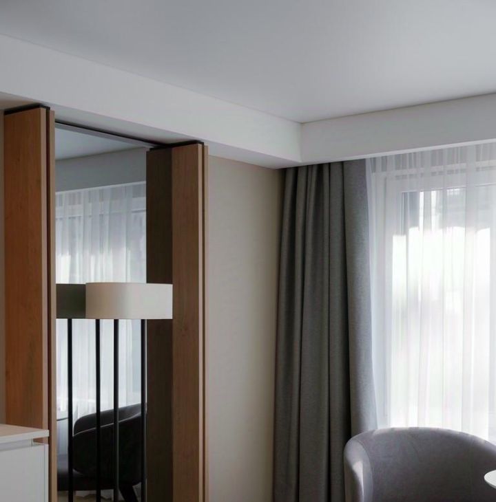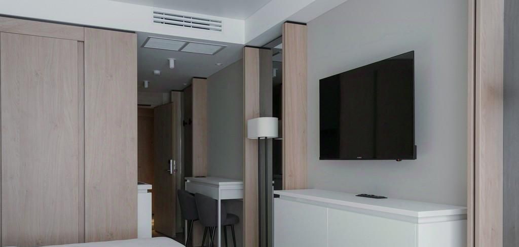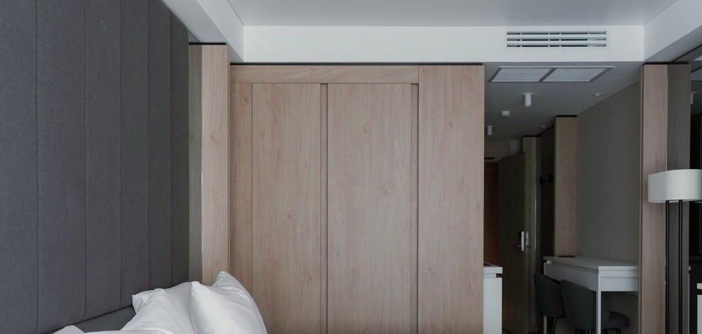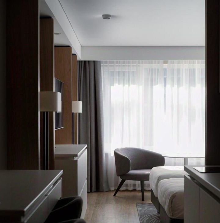 Минималистичный, светлый дизайн с теплыми оттенками. За счет больших панорамных окон в номере светло и уютно.
