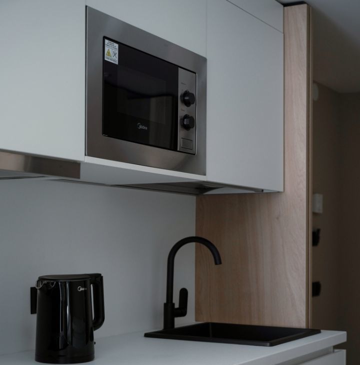 - Мини-кухня с холодильником, плитой для приготовления пищи, микроволновой печью, чайником и столовыми приборами.