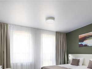 - В зоне релакса — большая кровать с ортопедическим матрасом, шторы блэкаут, широкие окна.
