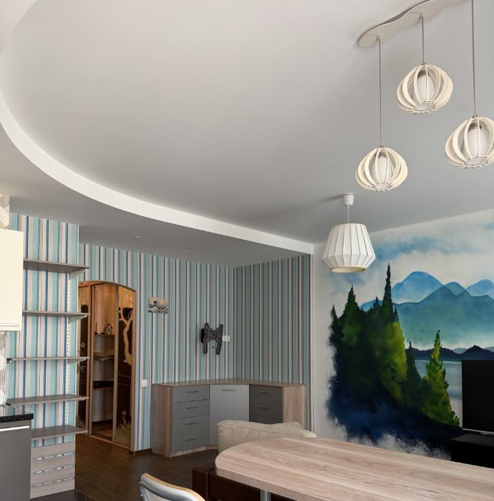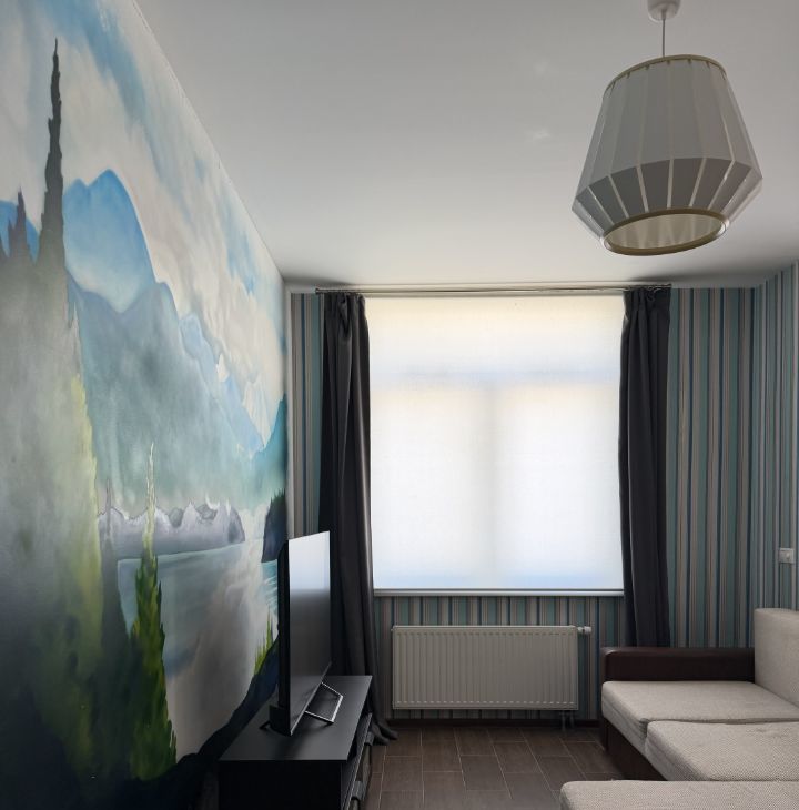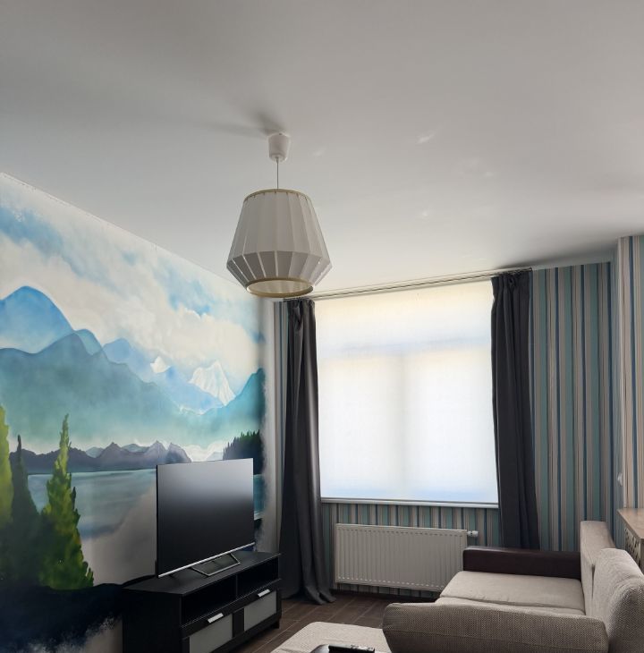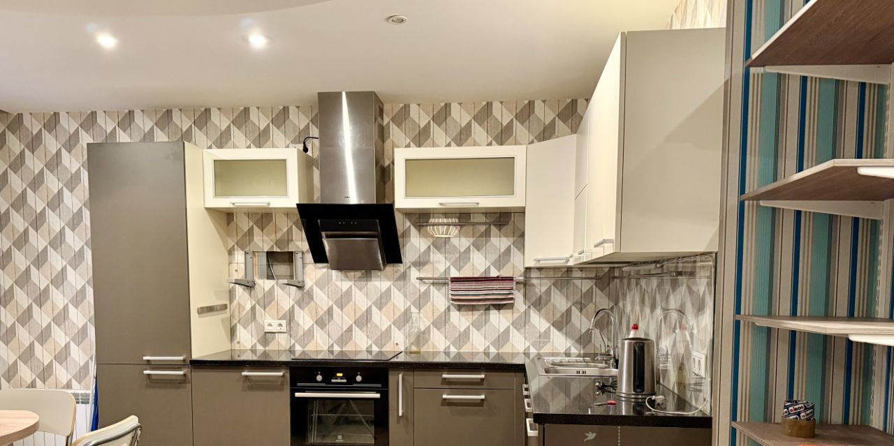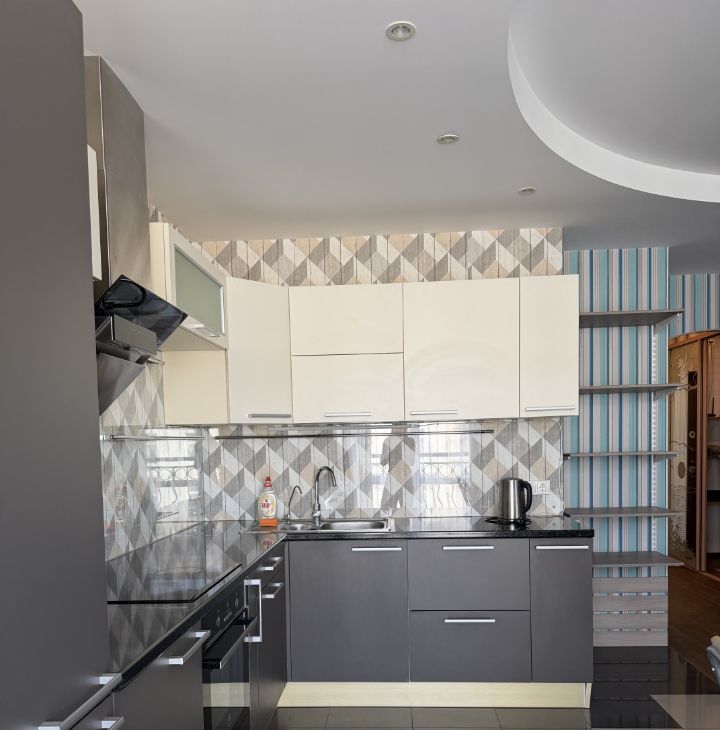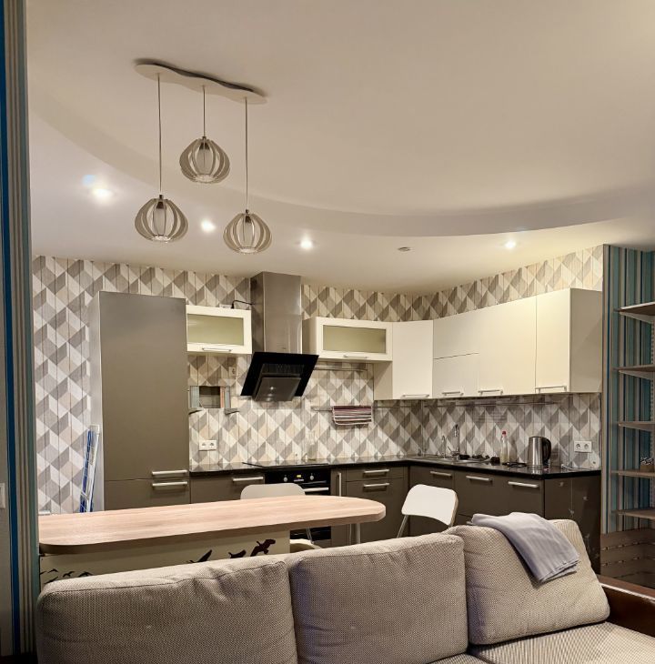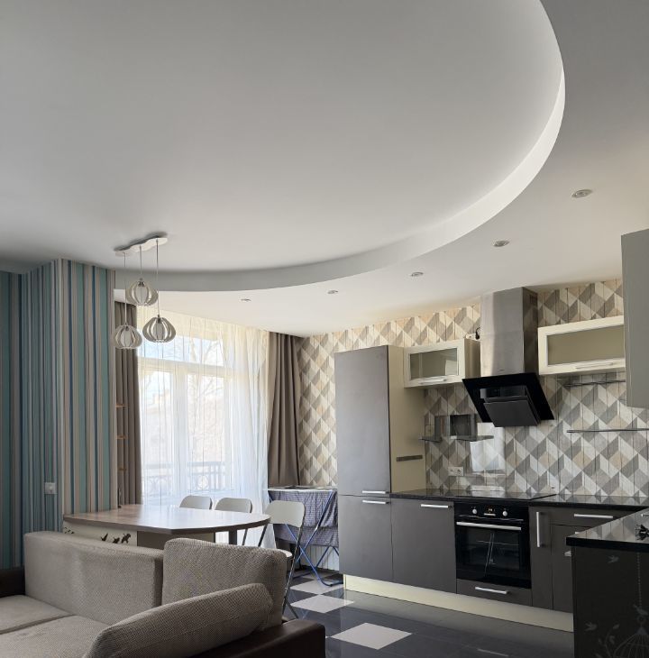 Сдается просторная однокомнатная квартира с евроремонтом в современном доме 2014 года постройки. Общая площадь квартиры составляет 50 кв. м, кухня — впечатляющие 30 кв. м. Квартира расположена на 5 этаже 9-этажного монолитного дома. Высота потолков — 3 метра, что создает ощущение простора. Окна выходят на улицу, а из балкона открывается прекрасный вид.