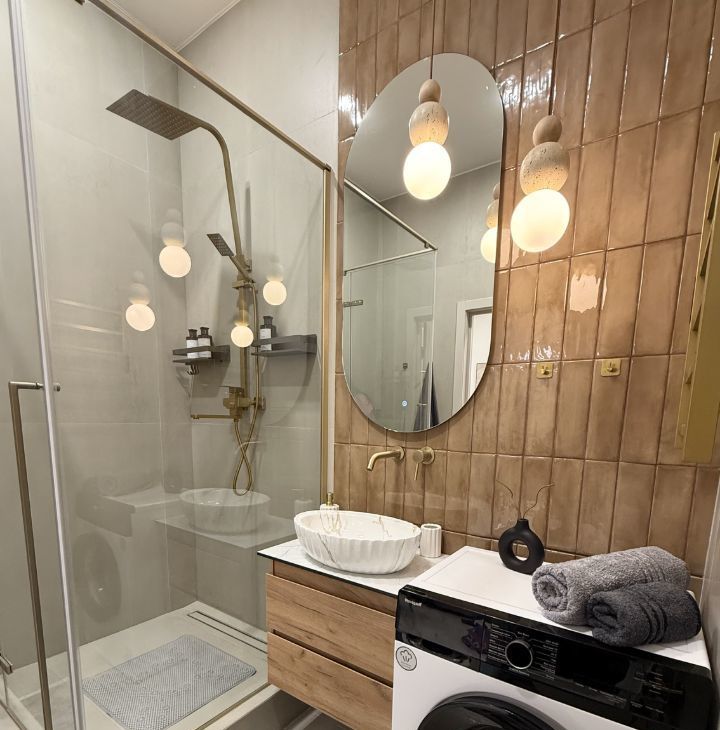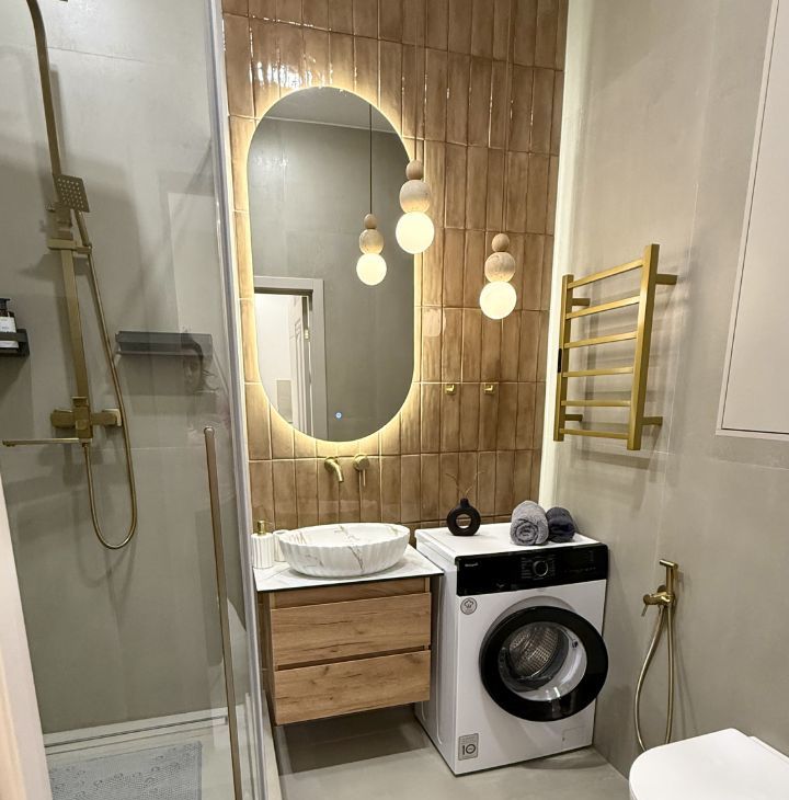 В совмещённом сан узле Душевая кабина, стиральная машина, полотенцесушитель
