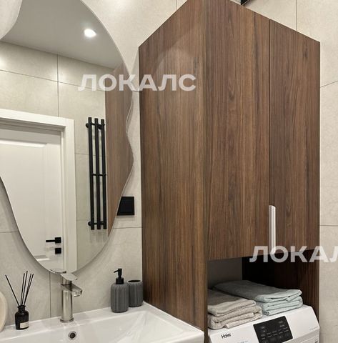• В санузле ванна, стиральная машина, бойлер, контроллер протечек, тумба, шкаф, зеркало с подсветкой;