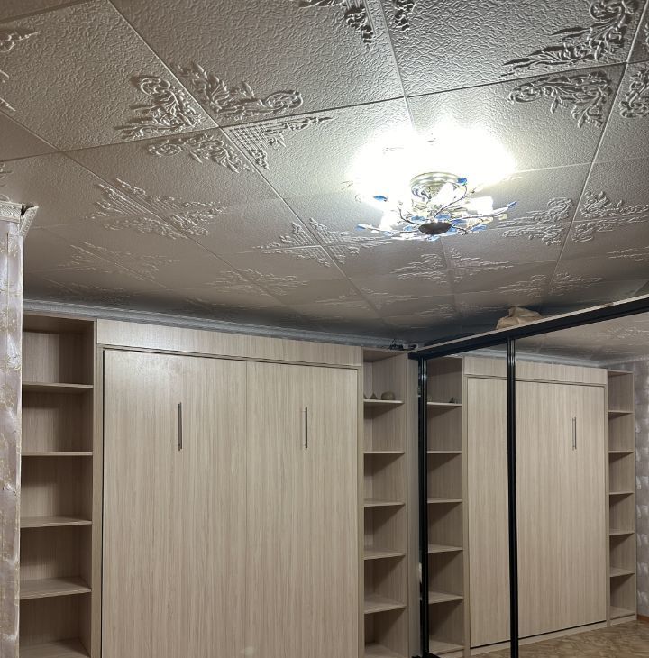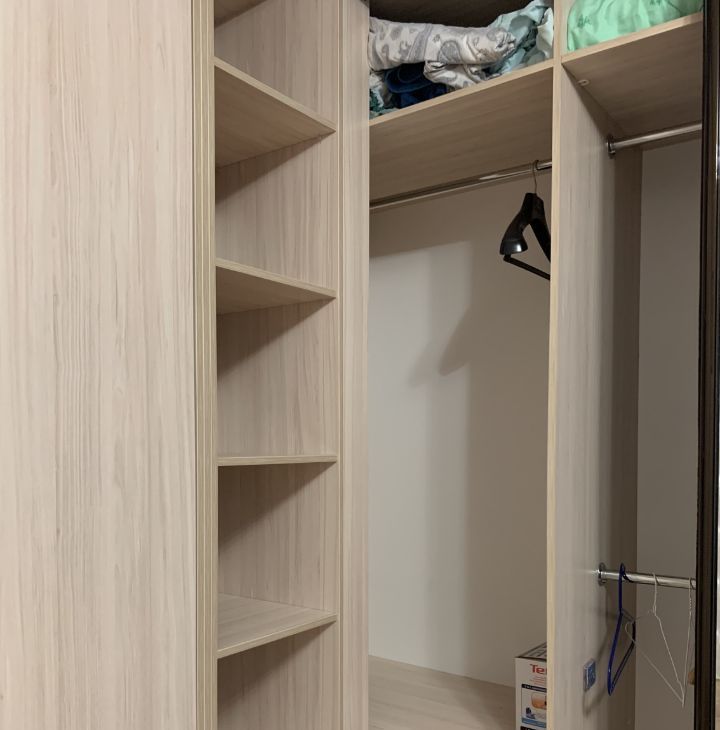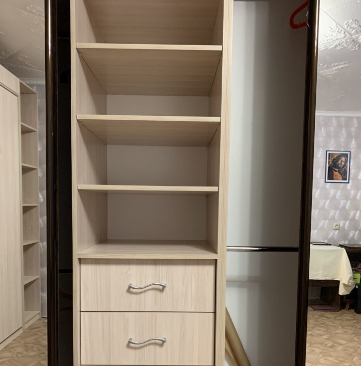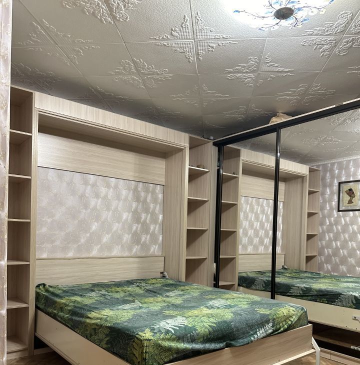 В комнате вертикальная кровать, вместительный шкаф купе, сделанные на заказ.