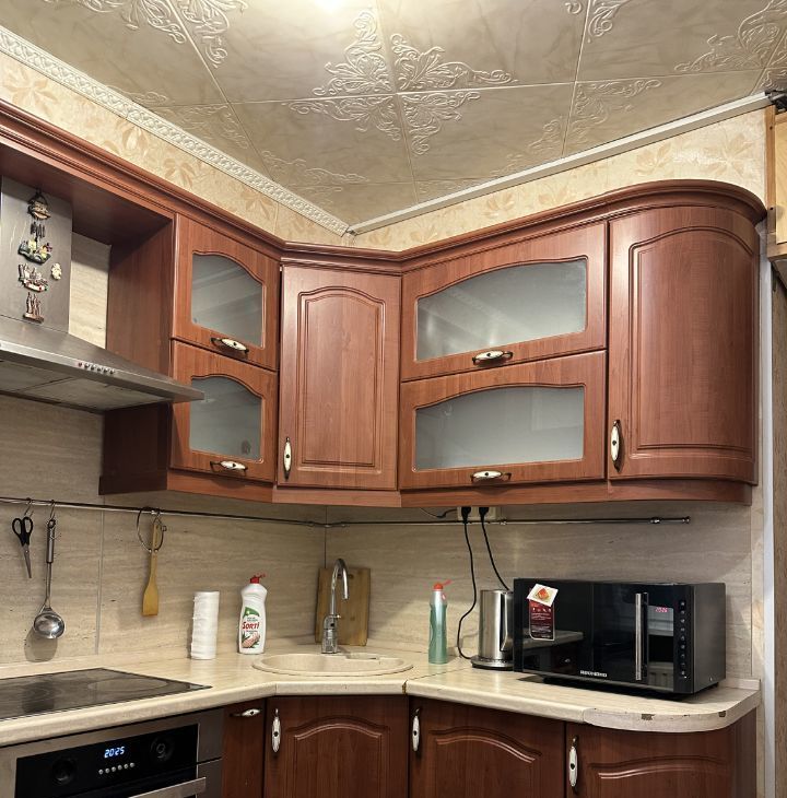 Есть микроволновка, чайник, новый холодильник, варочная панель, духовка, вытяжка в кухне и туалете.