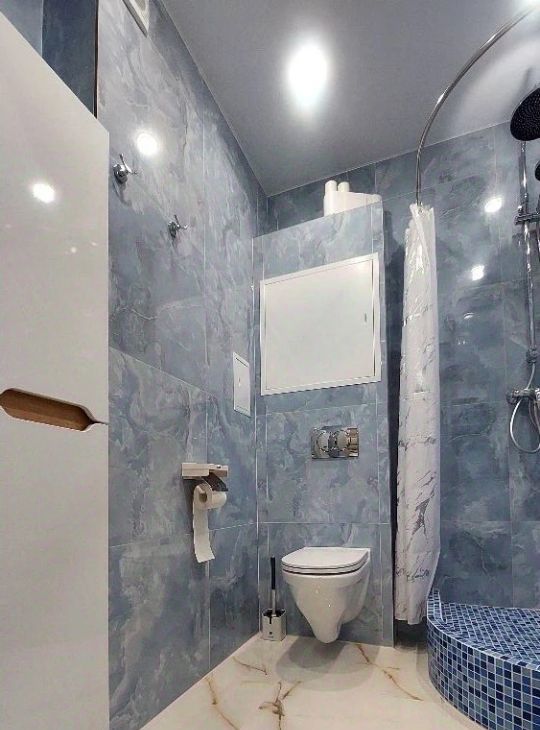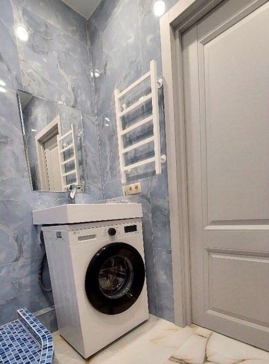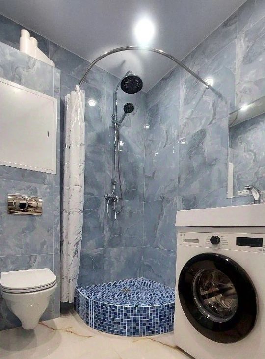 Санузел совмещённый, оформлен в стильном голубом цвете, оснащён стиральной машиной.