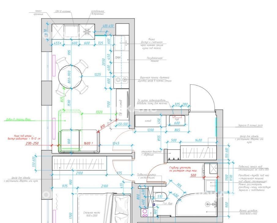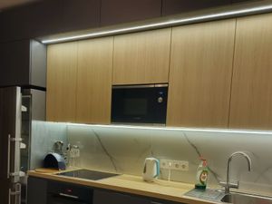 - Кухня-гостинная со встроенной техникой, холодильник, посудомоичная машина, духовой шкаф, микроволновка, индукционная плита, вытяжка, кран с фильтром, чайник, посуда. Диван раскладывается для приема гостей. ТВ при необходимости.