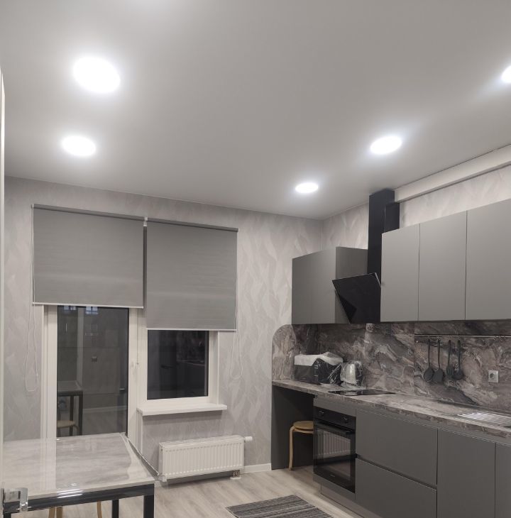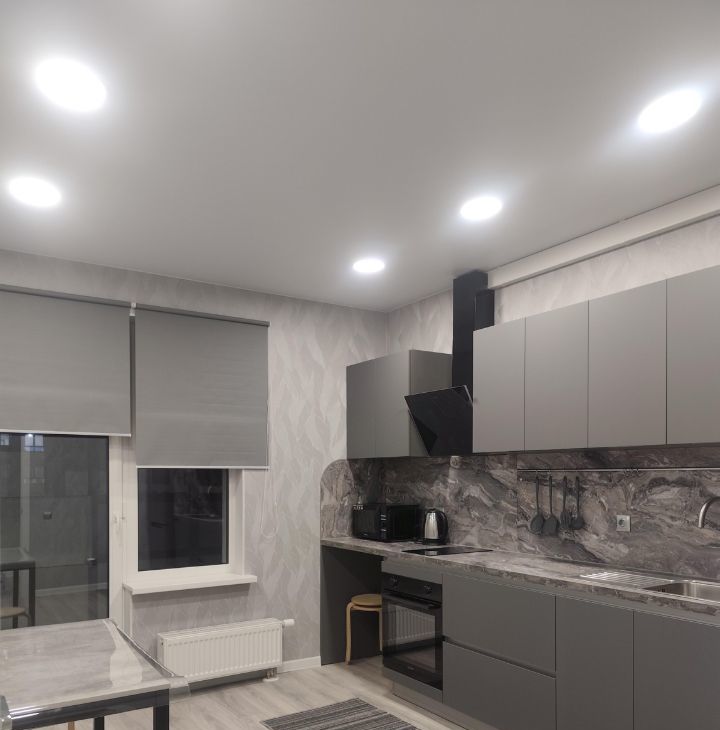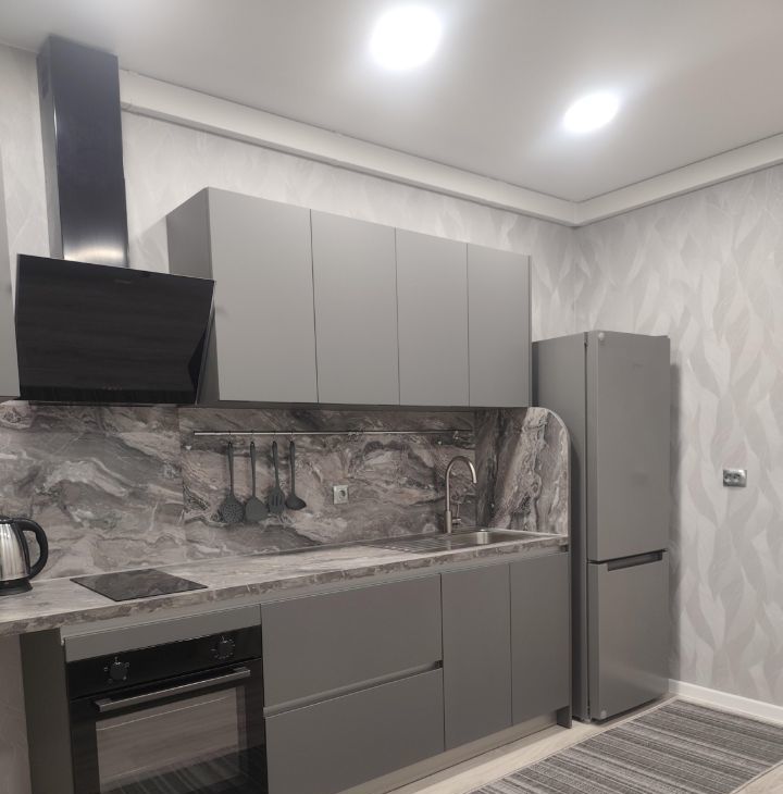 В квартире установлена стильная, функциональная кухня с варочной поверхностью, духовым шкафом и вытяжкой; есть вместительный холодильник с морозильной камерой; микроволновая печь и чайник, минимальный набор посуды.