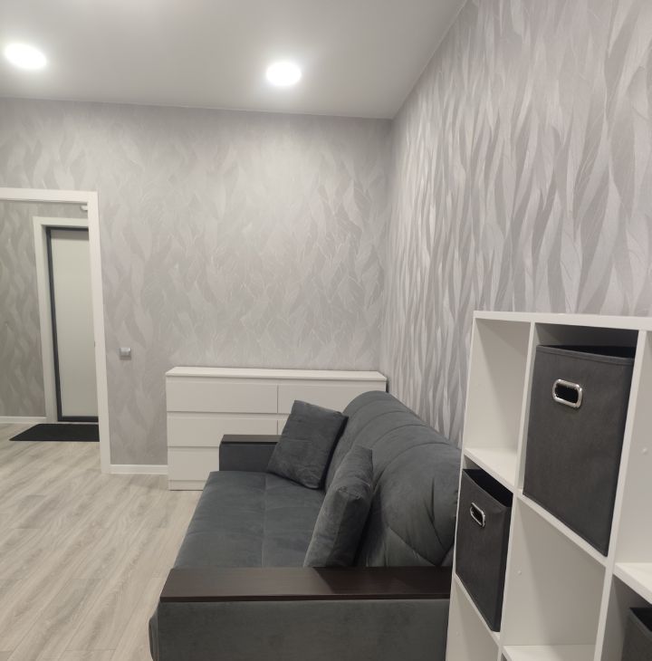 В комнате удобный диван (140*200 см в разложенном виде), комод для белья и полки для хранения мелочей, Смарт телевизор.