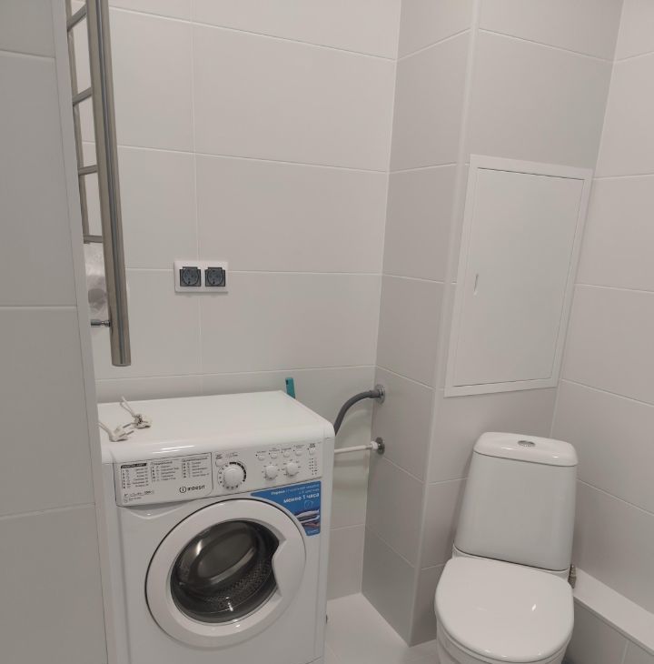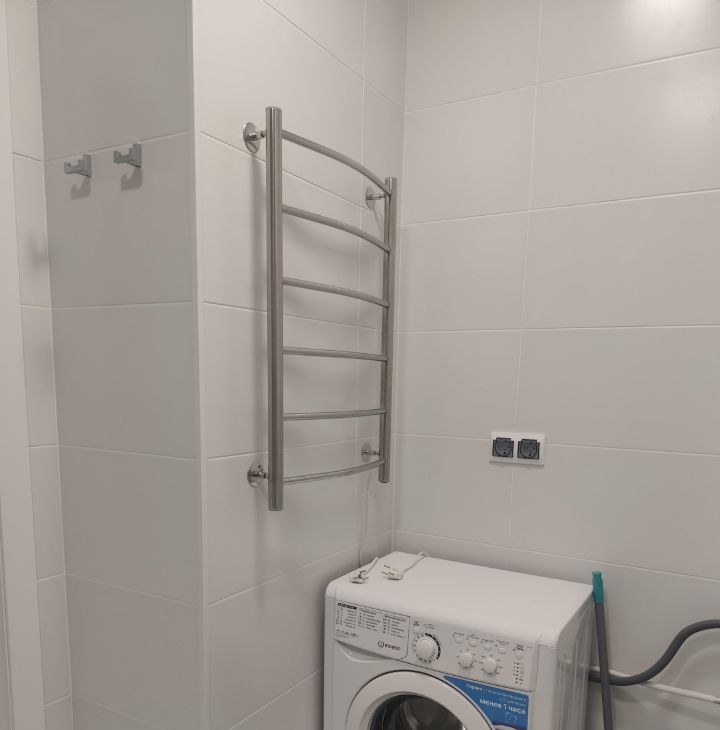 Санузел оснащен глубокой ванной, удобной раковиной; имеется стиральная машина и электрический полотенцесушитель.