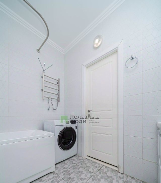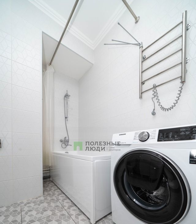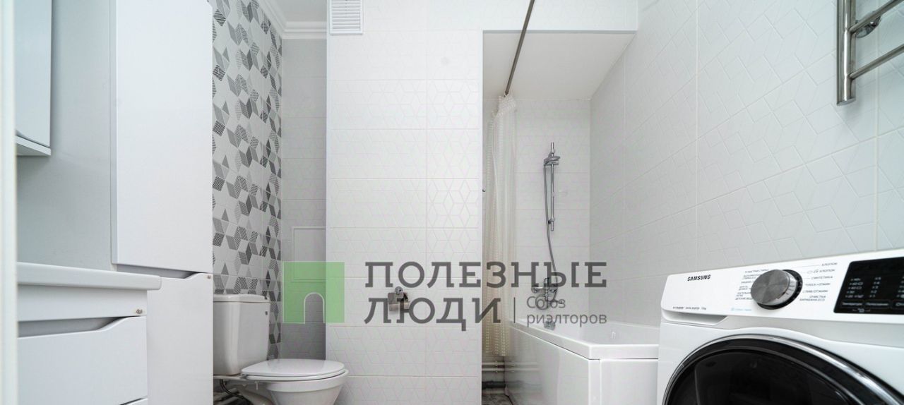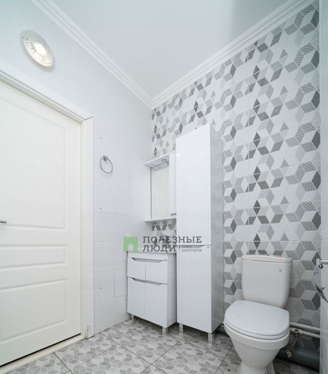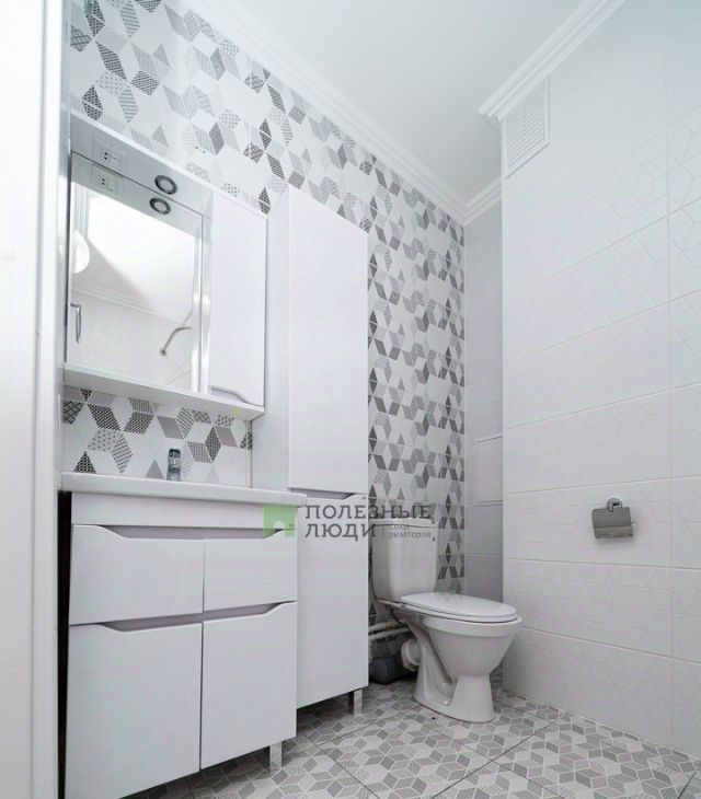 Ванная комната: совмещенный санузел в стильном кафеле с геометрическим узором. Установлена полноценная ванна, а также подвесные шкафы для хранения косметики и бытовой химии.
