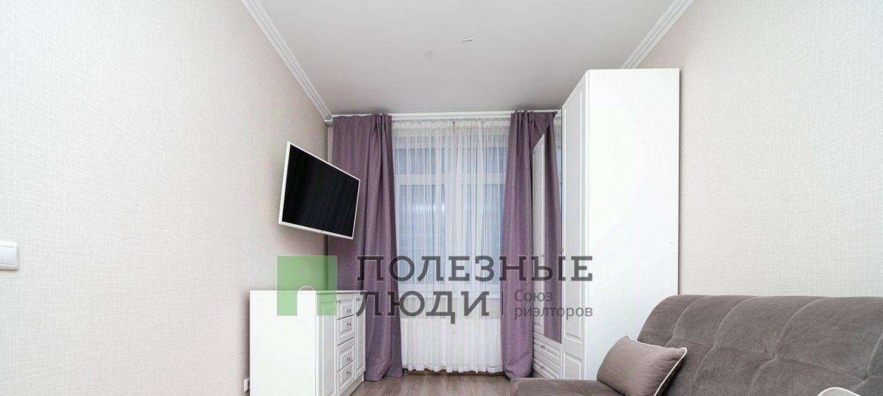 Светлая комната: оборудована удобным двуспальным диваном, большим шкафом с зеркалом, комодом и рабочей/туалетной консолью. Установлены плотные шторы (блэкаут) для комфортного сна и настенный плазменный телевизор.
