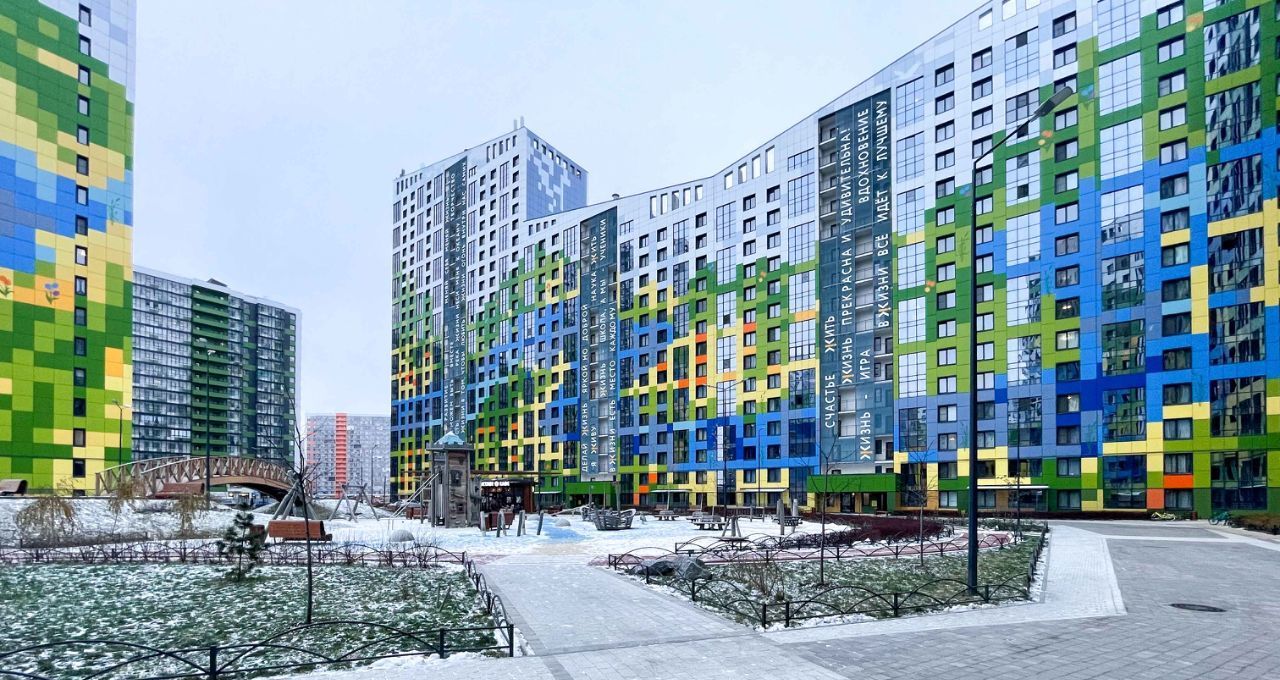Закрытая внутридомовая территория с детской площадкой и кофейней.