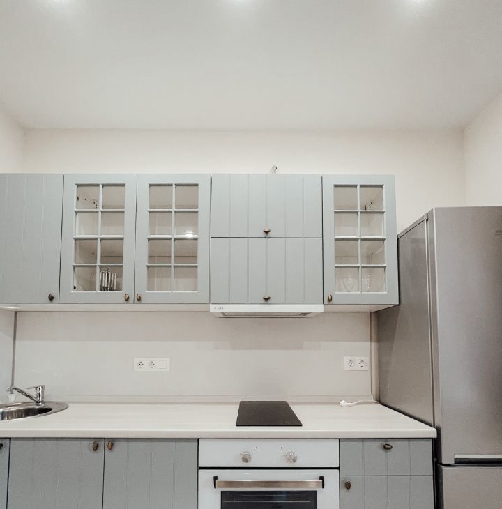 На кухне установлена вся необходимая бытовая техника: духовой шкаф, плита, холодильник, вытяжка.