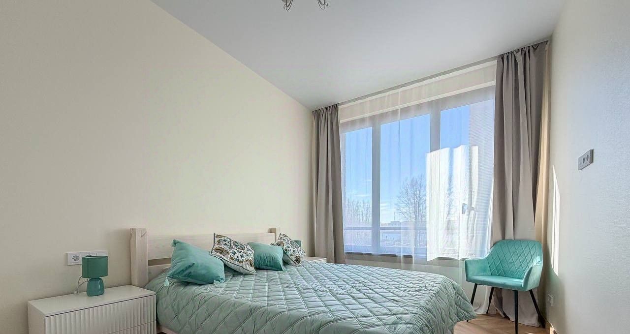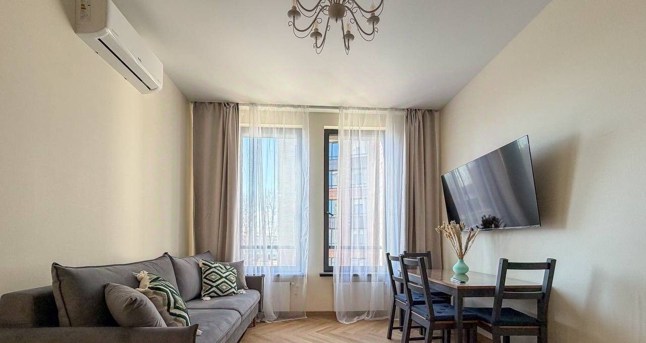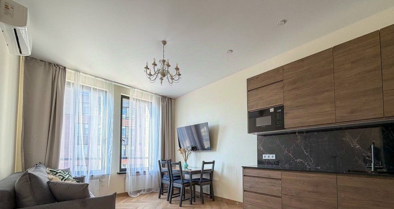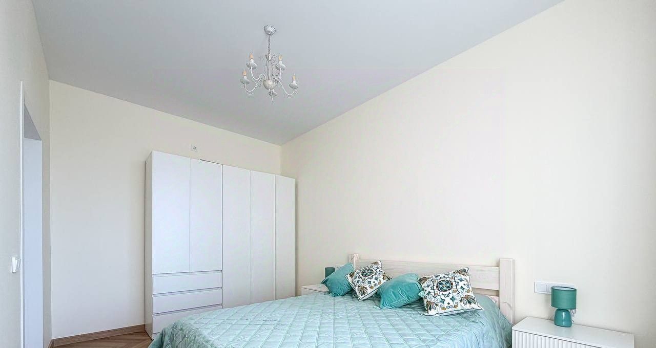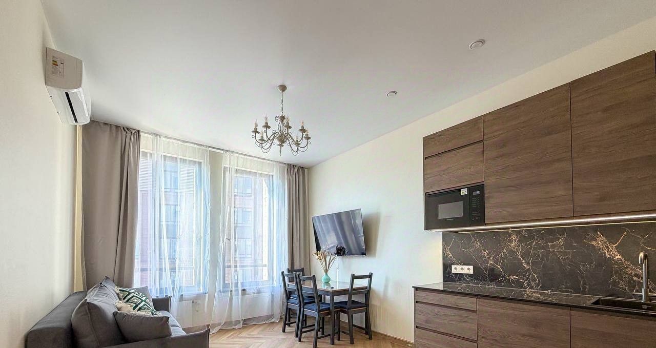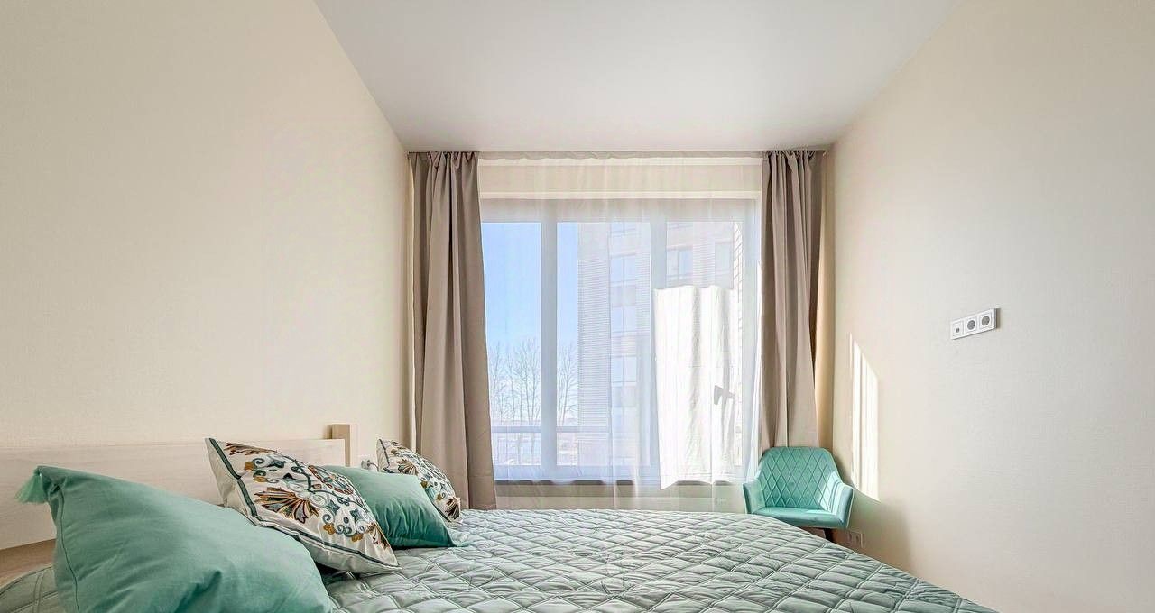 Планировка квартиры: изолированная спальня, просторная кухня-гостиная, совмещенный санузел. Есть вся необходимая мебель и бытовая техника для комфортного проживания, включая посудомоечную машинку и кондиционер. В квартире большие панорамные окна, которые выходят на солнечную сторону - очень много естественного света. Высота потолков - 3 метра. Из окон видно реку!